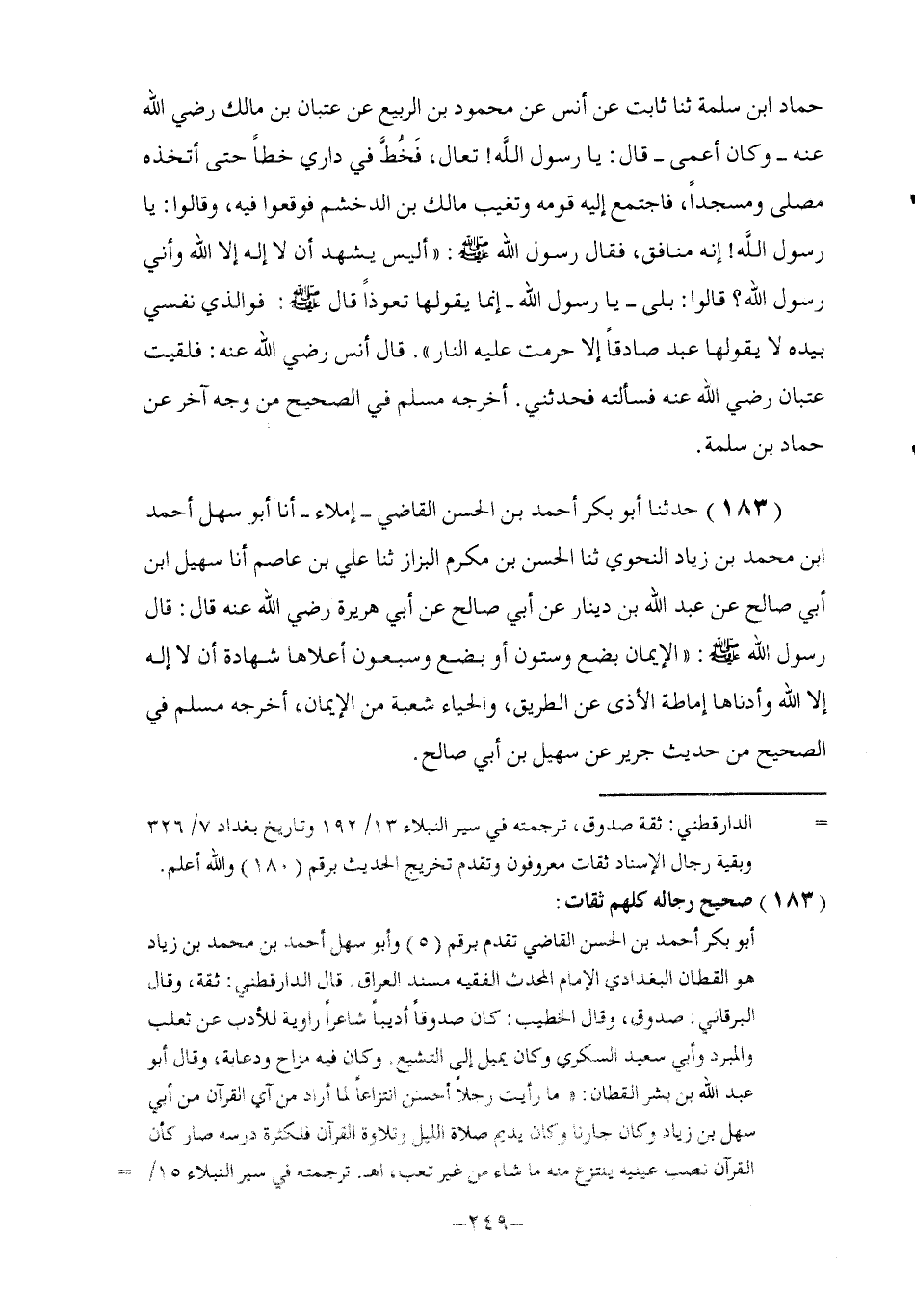 183 - حَدَّثَنَا أَبُو بَكْرٍ أَحْمَدُ بْنُ الْحَسَنِ الْقَاضِي إِمْلَاءً أنا أَبُو سَهْلٍ أَحْمَدُ بْنُ مُحَمَّدِ بْنِ زِيَادٍ النَّحْوِيُّ , ثنا الْحَسَنُ بْنُ مُكْرَمٍ الْبَزَّازُ , ثنا عَلِيُّ بْنُ عَاصِمٍ , أنا سُهَيْلُ بْنُ أَبِي صَالِحٍ , عَنْ عَبْدِ اللَّهِ بْنِ دِينَارٍ , عَنْ أَبِي صَالِحٍ , عَنْ أَبِي هُرَيْرَةَ , رَضِيَ اللَّهُ عَنْهُ قَالَ: قَالَ رَسُولُ اللَّهِ صَلَّى اللهُ عَلَيْهِ وَسَلَّمَ: §«الْإِيمَانُ بِضْعٌ وَسِتُّونَ أَوْ بِضْعٌ وَسَبْعُونَ أَعْلَاهَا شَهَادَةُ أَنْ لَا إِلَهَ إِلَّا اللَّهُ وَأَدْنَاهَا إِمَاطَةُ الْأَذَى عَنِ الطَّرِيقِ , وَالْحَيَاءُ شُعْبَةٌ مِنَ الْإِيمَانِ» أَخْرَجَهُ مُسْلِمٌ فِي الصَّحِيحِ مِنْ حَدِيثِ جَرِيرٍ عَنْ سُهَيْلِ بْنِ أَبِي صَالِحٍ