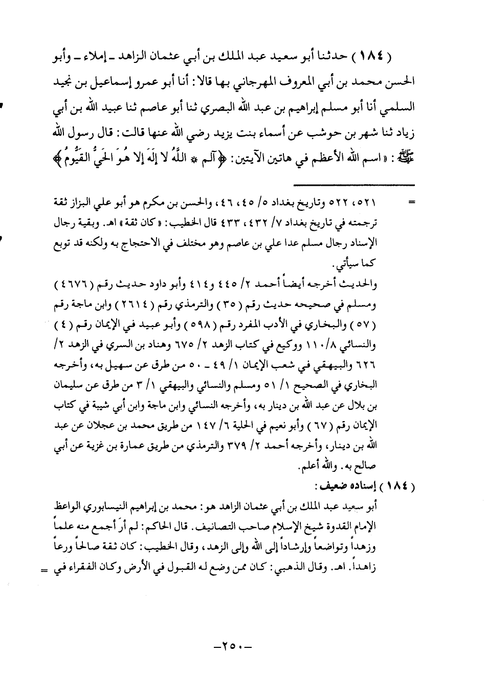 184 - حَدَّثَنَا أَبُو سَعِيدٍ عَبْدُ الْمَلِكِ بْنِ أَبِي عُثْمَانَ الزَّاهِدُ إِمْلَاءً وَأَبُو الْحَسَنِ مُحَمَّدُ بْنُ أَبِي الْمَعْرُوفِ الْمِهْرَجَانِيُّ بِهَا قَالَا: أنا أَبُو عَمْرٍو إِسْمَاعِيلُ بْنُ نُجَيْدٍ السُّلَمِيُّ , أنا أَبُو مُسْلِمٍ إِبْرَاهِيمُ بْنُ عَبْدِ اللَّهِ الْبَصْرِيُّ , ثنا أَبُو عَاصِمٍ , ثنا عُبَيْدُ اللَّهِ بْنُ أَبِي زِيَادٍ , ثنا شَهْرُ بْنُ حَوْشَبٍ , عَنْ أَسْمَاءَ بِنْتِ يَزِيدَ , رَضِيَ اللَّهُ عَنْهَا قَالَتْ: قَالَ رَسُولُ اللَّهِ صَلَّى اللهُ عَلَيْهِ وَسَلَّمَ: " §اسْمُ اللَّهِ الْأَعْظَمِ فِي هَاتَيْنِ الْآيَتَيْنِ: {الم اللَّهُ لَا إِلَهَ إِلَّا هُوَ الْحَيُّ الْقَيُّومُ} -[251]-[آل عمران: 2] , {وَإِلَهُكُمْ إِلَهٌ وَاحِدٌ لَا إِلَهَ إِلَّا هُوَ} [البقرة: 163] أَخْرَجَهُ أَبُو دَاوُدَ فِي كِتَابِ السُّنَنِ