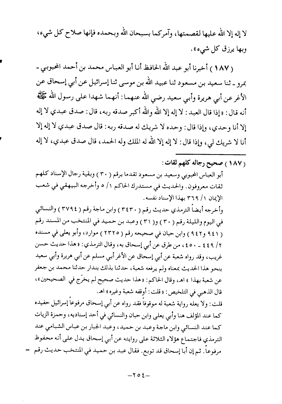 187 - أَخْبَرَنَا أَبُو عَبْدِ اللَّهِ الْحَافِظُ , أنا أَبُو الْعَبَّاسِ مُحَمَّدُ بْنُ أَحْمَدَ الْمَحْبُوبِيُّ بِمَرْوَ ثنا سَعِيدُ بْنُ مَسْعُودٍ , ثنا عُبَيْدُ اللَّهِ بْنُ مُوسَى , ثنا إِسْرَائِيلُ , عَنْ أَبِي إِسْحَاقَ , عَنِ الْأَغَرِّ , عَنْ أَبِي هُرَيْرَةَ , وَأَبَى سَعِيدٍ رَضِيَ اللَّهُ عَنْهُمَا: أَنَّهُمَا شَهِدَا عَلَى رَسُولِ اللَّهِ صَلَّى اللهُ عَلَيْهِ وَسَلَّمَ أَنَّهُ قَالَ: " §إِذَا قَالَ الْعَبْدُ: لَا إِلَهَ إِلَّا اللَّهُ وَاللَّهُ أَكْبَرُ صَدَّقَهُ رَبُّهُ , قَالَ: صَدَقَ عَبْدِي لَا إِلَهَ إِلَّا أَنَا وَحْدِي , وَإِذَا قَالَ: وَحْدَهُ لَا شَرِيكَ لَهُ صَدَّقَهُ رَبُّهُ قَالَ: صَدَقَ عَبْدِي لَا إِلَهَ إِلَّا أَنَا لَا شَرِيكَ لِي , وَإِذَا قَالَ: لَا إِلَهَ إِلَّا اللَّهُ لَهُ الْمُلْكُ وَلَهُ الْحَمْدُ , قَالَ: صَدَقَ عَبْدِي , لَا إِلَهَ إِلَّا أَنَا لِي الْمُلْكُ وَلِي الْحَمْدُ , وَإِذَا قَالَ: لَا إِلَهَ -[255]- إِلَّا اللَّهُ وَلَا حَوْلَ وَلَا قُوَّةَ إِلَّا بِاللَّهِ , قَالَ: صَدَقَ عَبْدِي وَلَا حَوْلَ وَلَا قُوَّةَ إِلَّا بِي "