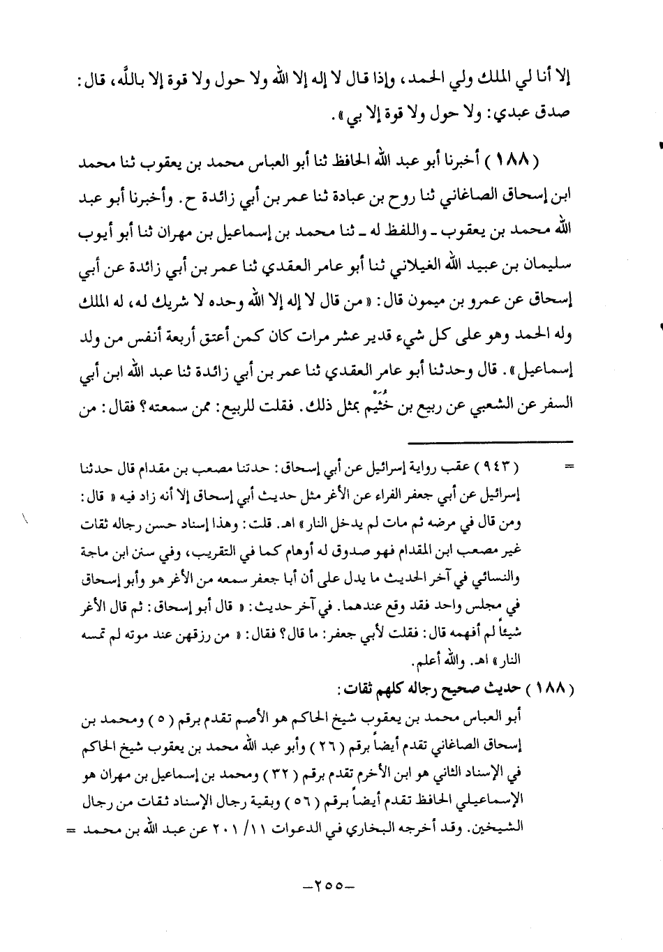 188 - أَخْبَرَنَا أَبُو عَبْدِ اللَّهِ الْحَافِظُ , ثنا أَبُو الْعَبَّاسِ مُحَمَّدُ بْنُ يَعْقُوبَ , ثنا مُحَمَّدُ بْنُ إِسْحَاقَ الصَّاغَانِيُّ , ثنا رَوْحُ بْنُ عُبَادَةَ , ثنا عُمَرُ بْنُ أَبِي زَائِدَةَ ح , وَأَخْبَرَنَا أَبُو عَبْدِ اللَّهِ مُحَمَّدُ بْنُ يَعْقُوبَ - وَاللَّفْظُ لَهُ - ثنا مُحَمَّدُ بْنُ إِسْمَاعِيلَ بْنِ مِهْرَانَ , ثنا أَبُو أَيُّوبَ سُلَيْمَانُ بْنُ عُبَيْدِ اللَّهِ الْغَيْلَانِيُّ , ثنا أَبُو عَامِرٍ الْعَقَدِيُّ , ثنا عُمَرُ بْنُ أَبِي زَائِدَةَ , عَنْ أَبِي إِسْحَاقَ , عَنْ عَمْرِو بْنِ مَيْمُونٍ , قَالَ: §مَنْ قَالَ لَا إِلَهَ إِلَّا اللَّهُ وَحْدَهُ لَا شَرِيكَ لَهُ , لَهُ الْمُلْكُ وَلَهُ الْحَمْدُ وَهُوَ عَلَى كُلِّ شَيْءٍ قَدِيرٌ عَشْرَ مَرَّاتٍ كَانَ كَمَنْ أَعْتَقَ أَرْبَعَةَ أَنْفُسٍ مِنْ وَلَدِ إِسْمَاعِيلَ " قَالَ: وَحَدَّثَنَا أَبُو عَامِرٍ الْعَقَدِيُّ , ثنا عُمَرُ بْنُ أَبِي زَائِدَةَ , ثنا عَبْدُ اللَّهِ بْنُ أَبِي السَّفَرِ عَنِ الشَّعْبِيِّ عَنْ رَبِيعِ بْنِ خُثَيْمٍ بِمِثْلِ ذَلِكَ فَقُلْتُ لِلرَّبِيعِ: مِمَّنْ سَمِعْتَهُ؟ فَقَالَ: مِنِ -[256]- ابْنِ أَبِي لَيْلَى فَأَتَيْتُ ابْنَ أَبِي لَيْلَىَ فقُلْتُ: مِمَّنْ سَمِعْتَهُ؟ فَقَالَ: مِنْ أَبِي أَيُّوبَ الْأَنْصَارِيِّ يُحَدِّثُهُ عَنْ رَسُولِ اللَّهِ صَلَّى اللهُ عَلَيْهِ وَسَلَّمَ قَالَ أَبُو عَبْدِ اللَّهِ: وَقَدْ ذَكَرَ الصَّاغَاتِيُّ عَنْ رَوْحٍ الْإِسْنَادَيْنِ جَمِيعًا , وَقَالَ فِي حَدِيثِهِ: كَانَ كَمَنْ أَعْتَقَ أَرْبَعَ رِقَابٍ مِنْ وَلَدِ إِسْمَاعِيلَ رَوَاهُ مُسْلِمٌ فِي الصَّحِيحِ عَنْ أَبِي أَيُّوبَ سُلَيْمَانَ بْنِ عُبَيْدِ اللَّهِ وَرَوَاهُ الْبُخَارِيُّ عَنْ عَبْدِ اللَّهِ بْنِ مُحَمَّدٍ عَنْ أَبِي عَامِرٍ الْعَقَدِيِّ
