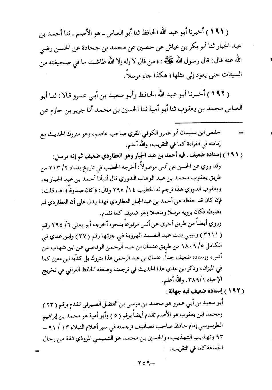 191 - أَخْبَرَنَا أَبُو عَبْدِ اللَّهِ الْحَافِظُ , ثنا أَبُو الْعَبَّاسِ هُوَ الْأَصَمُّ , ثنا أَحْمَدُ بْنُ عَبْدِ الْجَبَّارِ , ثنا أَبُو بَكْرِ بْنُ عَيَّاشٍ , عَنْ أَبِي حُصَيْنٍ , عَنْ مُحَمَّدِ بْنِ جُحَادَةَ , عَنِ الْحَسَنِ , رَضِيَ اللَّهُ عَنْهُ قَالَ: قَالَ رَسُولُ اللَّهِ صَلَّى اللهُ عَلَيْهِ وَسَلَّمَ: §«مَنْ قَالَ لَا إِلَهَ إِلَّا اللَّهُ طَاشَتْ مَا فِي صَحِيفَتُهُ مِنَ السَّيِّئَاتِ حَتَّى يَعُودَ إِلَى مِثْلَهَا» هَكَذَا جَاءَ مُرْسَلًا