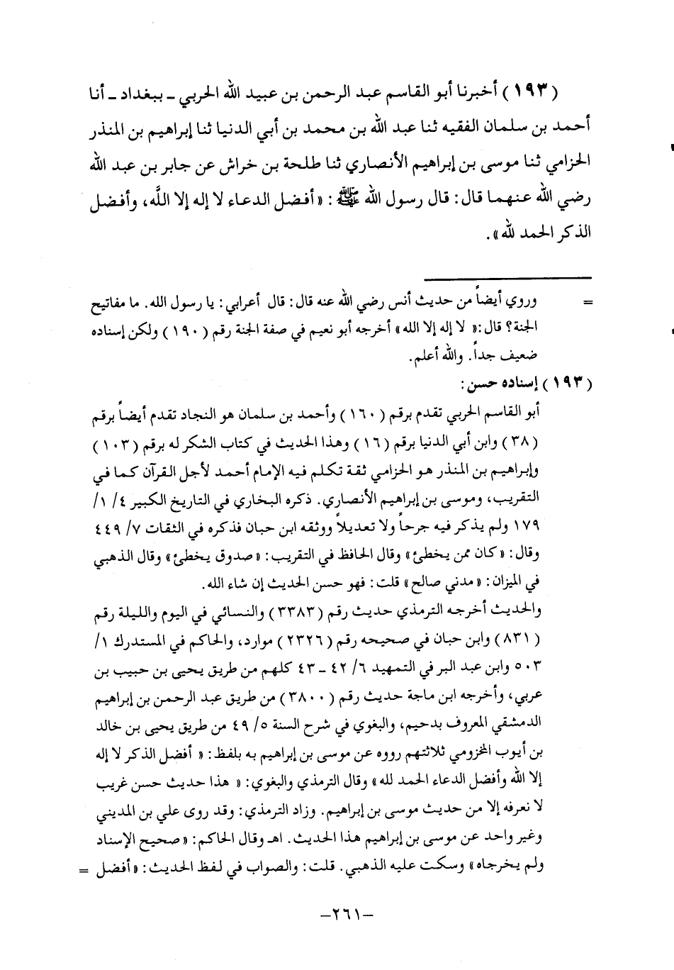 193 - أَخْبَرَنَا أَبُو الْقَاسِمِ عَبْدُ الرَّحْمَنِ بْنُ عُبَيْدِ اللَّهِ الْحَرْبِيُّ , بِبَغْدَادَ، أنا أَحْمَدُ بْنُ سَلْمَانَ الْفَقِيهُ , ثنا عَبْدُ اللَّهِ بْنُ مُحَمَّدِ بْنِ أَبِي الدُّنْيَا , ثنا إِبْرَاهِيمُ بْنُ الْمُنْذِرِ الْحِزَامِيُّ , ثنا مُوسَى بْنُ إِبْرَاهِيمَ الْأَنْصَارِيُّ , ثنا طَلْحَةُ بْنُ خِرَاشٍ , عَنْ جَابِرِ بْنِ عَبْدِ اللَّهِ , رَضِيَ اللَّهُ عَنْهُمَا قَالَ: قَالَ رَسُولُ اللَّهِ صَلَّى اللهُ عَلَيْهِ وَسَلَّمَ: §«أَفْضَلُ الدُّعَاءِ لَا إِلَهَ إِلَّا اللَّهُ , وَأَفْضَلُ الذِّكْرِ الْحَمْدُ لِلَّهِ»