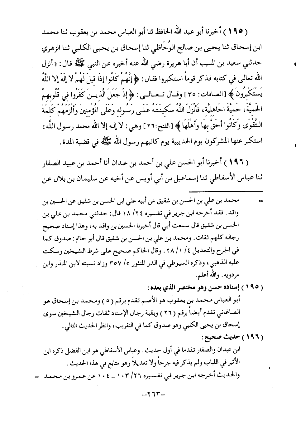195 - أَخْبَرَنَا أَبُو عَبْدِ اللَّهِ الْحَافِظُ , ثنا أَبُو الْعَبَّاسِ مُحَمَّدُ بْنُ يَعْقُوبَ , ثنا مُحَمَّدُ بْنُ إِسْحَاقَ , ثنا يَحْيَى بْنُ صَالِحٍ الْوُحَاظِيُّ , ثنا إِسْحَاقُ بْنُ يَحْيَى الْكَلْبِيُّ , ثنا الزُّهْرِيُّ , حَدَّثَنِي سَعِيدُ بْنُ الْمُسَيِّبِ , أَنَّ أَبَا هُرَيْرَةَ , رَضِيَ اللَّهُ عَنْهُ أَخْبَرَهُ عَنِ النَّبِيِّ صَلَّى اللهُ عَلَيْهِ وَسَلَّمَ قَالَ: " §أَنْزَلَ اللَّهُ تَعَالَى فِي كِتَابِهِ فَذَكَرَ قَوْمًا اسْتَكْبَرُوا فَقَالَ: {إِنَّهُمْ كَانُوا إِذَا قِيلَ لَهُمْ لَا إِلَهَ إِلَّا اللَّهُ يَسْتَكْبِرُونَ} [الصافات: 35] وَقَالَ تَعَالَى: {إِذْ جَعَلَ الَّذِينَ كَفَرُوا فِي قُلُوبِهِمُ الْحَمِيَّةَ حَمِيَّةَ الْجَاهِلِيَّةِ فَأَنْزَلَ اللَّهُ سَكِينَتَهُ عَلَى رَسُولِهِ وَعَلَى الْمُؤْمِنِينَ وَأَلْزَمَهُمْ كَلِمَةَ التَّقْوَى وَكَانُوا أَحَقَّ بِهَا وَأَهْلَهَا} [الفتح: 26] وَهِيَ لَا إِلَهَ إِلَّا اللَّهُ مُحَمَّدٌ رَسُولُ اللَّهِ " اسْتَكْبَرَ عَنْهَا الْمُشْرِكُونَ يَوْمَ الْحُدَيْبِيَةِ يَوْمَ كَاتَبَهُمْ رَسُولُ اللَّهِ صَلَّى اللهُ عَلَيْهِ وَسَلَّمَ فِي قَضِيَّةِ الْمُدَّةِ