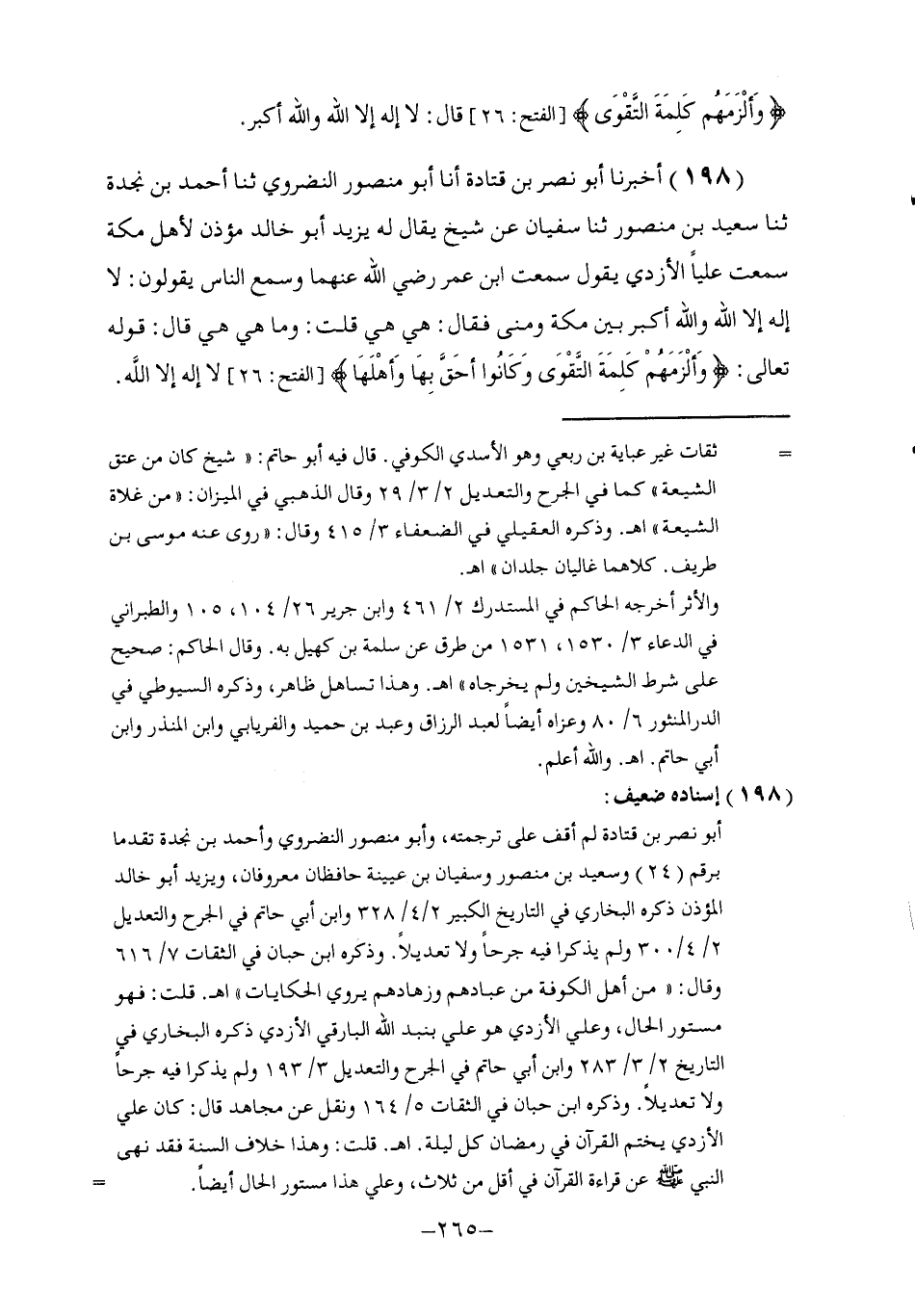 198 - أَخْبَرَنَا أَبُو نَصْرِ بْنُ قَتَادَةَ , أنا أَبُو مَنْصُورٍ النَّضْرَوِيُّ , ثنا أَحْمَدُ بْنُ نَجْدَةَ , ثنا سَعِيدُ بْنُ مَنْصُورٍ , ثنا سُفْيَانُ , عَنْ شَيْخٍ يُقَالُ لَهُ يَزِيدُ أَبُو خَالِدٍ مُؤَذِّنٌ لِأَهْلِ مَكَّةَ، سَمِعْتُ عَلِيًّا الْأَزْدِيَّ , يَقُولُ: سَمِعْتُ ابْنَ عُمَرَ , رَضِيَ اللَّهُ عَنْهُمَا وَسَمِعَ النَّاسَ , يَقُولُونَ: §لَا إِلَهَ إِلَّا اللَّهُ وَاللَّهُ أَكْبَرُ بَيْنَ مَكَّةَ وَمِنًى فَقَالَ: " هِيَ هِيَ، قُلْتُ: وَمَا هِيَ هِيَ؟ قَالَ: قَوْلُهُ تَعَالَى: {وَأَلْزَمَهُمْ كَلِمَةَ التَّقْوَى وَكَانُوا أَحَقَّ بِهَا وَأَهْلَهَا} [الفتح: 26] لَا إِلَهَ إِلَّا اللَّهُ "