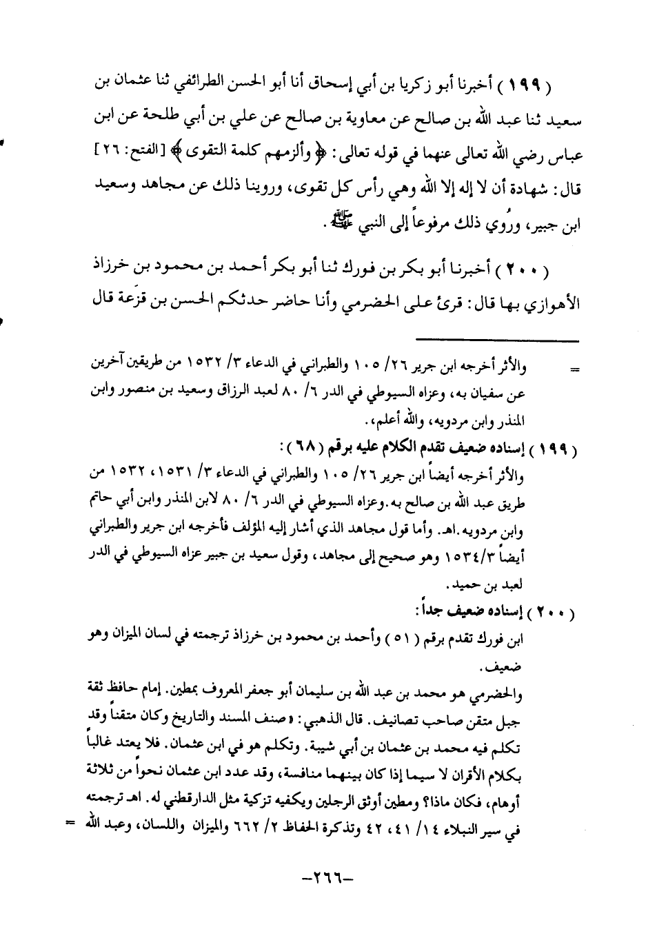 199 - أَخْبَرَنَا أَبُو زَكَرِيَّا بْنُ أَبِي إِسْحَاقَ , أنا أَبُو الْحَسَنِ الطَّرَائِفِيُّ , ثنا عُثْمَانُ بْنُ سَعِيدٍ , ثنا عَبْدُ اللَّهِ بْنُ صَالِحٍ , عَنْ معاوية بن صالح، عَن عَلِيِّ بْنِ أَبِي طَلْحَةَ , عَنِ ابْنِ عَبَّاسٍ , رَضِيَ اللَّهُ تَعَالَى عَنْهُمَا فِي قَوْلِهِ تَعَالَى: {§وَأَلْزَمَهُمْ كَلِمَةَ التَّقْوَى} [الفتح: 26] قَالَ: شَهَادَةُ أَنْ لَا إِلَهَ إِلَّا اللَّهُ وَهِيَ رَأْسُ كُلِّ تَقْوَى وَرُوِّينَا ذَلِكَ عَنْ مُجَاهِدٍ وَسَعِيدِ بْنِ جُبَيْرٍ , وَرُوِيَ ذَلِكَ مَرْفُوعًا إِلَى النَّبِيِّ صَلَّى اللهُ عَلَيْهِ وَسَلَّمَ