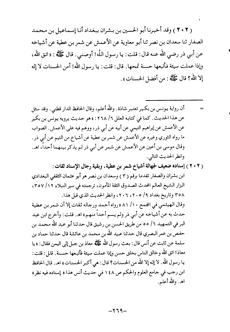 202 - وَقَدْ أَخْبَرَنَا أَبُو الْحُسَيْنِ بْنُ بِشْرَانَ , بِبَغْدَادَ , أنا إِسْمَاعِيلُ بْنُ مُحَمَّدٍ الصَّفَّارُ , ثنا سَعْدَانُ بْنُ نَصْرٍ , ثنا أَبُو مُعَاوِيَةَ , عَنِ الْأَعْمَشِ , عَنْ شِمْرِ بْنِ عَطِيَّةَ , عَنْ أَشْيَاخِهِ , عَنْ أَبِي ذَرٍّ , رَضِيَ اللَّهُ عَنْهُ قَالَ: قُلْتُ: يَا رَسُولَ اللَّهِ أَوْصِنِي، قَالَ صَلَّى اللهُ عَلَيْهِ وَسَلَّمَ: §«اتَّقِ اللَّهَ , وَإِذَا عَمِلْتَ سَيِّئَةً فَأَتْبِعْهَا حَسَنَةً تَمْحُهَا» قَالَ: قُلْتُ: يَا رَسُولَ اللَّهِ أَمِنَ الْحَسَنَاتِ لَا إِلَهَ إِلَّا اللَّهُ قَالَ صَلَّى اللهُ عَلَيْهِ وَسَلَّمَ: «مِنْ أَفْضَلِ الْحَسَنَاتِ»