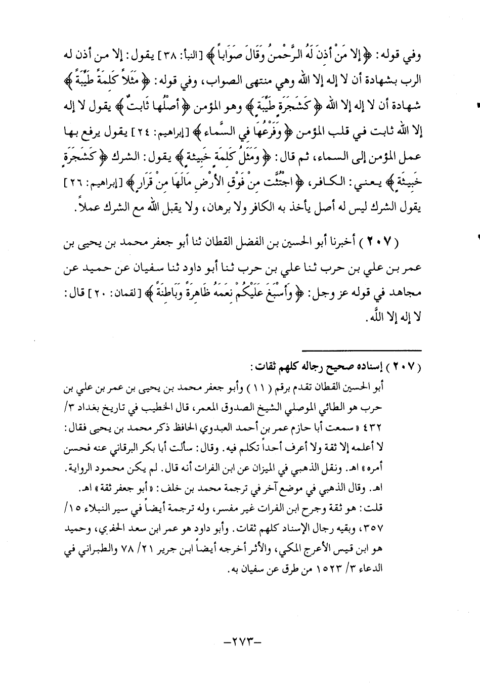 207 - أَخْبَرَنَا أَبُو الْحُسَيْنِ بْنُ الْفَضْلِ الْقَطَّانُ , ثنا أَبُو جَعْفَرٍ مُحَمَّدُ بْنُ يَحْيَى بْنِ عُمَرَ بْنِ عَلِيِّ بْنِ حَرْبٍ، ثَنَا عَلِيُّ بْنُ حَرْبٍ، ثَنَا أَبُو دَاوُدَ , ثنا سُفْيَانُ , عَنْ حُمَيْدٍ , عَنْ مُجَاهِدٍ , فِي قَوْلِهِ عَزَّ وَجَلَّ: {§وَأَسْبَغَ عَلَيْكُمْ نِعَمَهُ ظَاهِرَةً وَبَاطِنَةً} [لقمان: 20] قَالَ: لَا إِلَهَ إِلَّا اللَّهُ