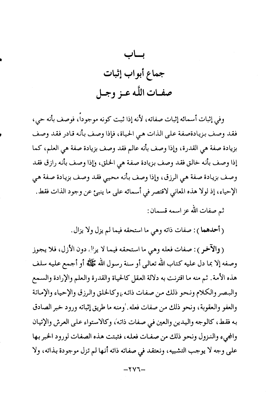 §بَابُ جُمَّاعِ أَبْوَابِ إِثْبَاتِ صِفَاتِ اللَّهِ عَزَّ وَجَلَّ وَفِي إِثْبَاتِ أَسْمَائِهِ إِثْبَاتُ صِفَاتِهِ , لِأَنَّهُ إِذَا ثَبَتَ كَوْنُهُ مَوْجُودًا , فَوُصِفَ بِأَنَّهُ حَيٌّ , فَقَدْ وُصِفَ بِزِيَادَةِ صِفَةٍ عَلَى الذَّاتِ هِيَ الْحَيَاةُ , فَإِذَا وُصِفَ بِأَنَّهُ قَادِرٌ فَقَدْ وُصِفَ بِزِيَادَةِ صِفَةٍ هِيَ الْقُدْرَةُ , وَإِذَا وُصِفَ بِأَنَّهُ عَالِمٌ فَقَدْ وُصِفَ بِزِيَادَةِ صِفَةٍ هِيَ الْعِلْمُ , كَمَا إِذَا وُصِفَ بِأَنَّهُ خَالِقٌ فَقَدْ وُصِفَ بِزِيَادَةِ صِفَةٍ هِيَ الْخَلْقُ , وَإِذَا وُصِفَ بِأَنَّهُ رَازَقٌ فَقَدْ وُصِفَ بِزِيَادَةِ صِفَةٍ هِيَ الرِّزْقُ , وَإِذَا وُصِفَ بِأَنَّهُ مُحْيِي فَقَدْ وُصِفَ بِزِيَادَةِ صِفَةٍ هِيَ الْإِحْيَاءُ , إِذْ لَوْلَا هَذِهِ الْمَعَانِي لَاقْتَصَرَ فِي أَسْمَائِهِ عَلَى مَا يُنْبِئُ عَنْ وُجُودِ الذَّاتِ فَقَطْ ثُمَّ صِفَاتُ اللَّهِ عَزَّ اسْمُهُ قِسْمَانِ: «أَحَدُهُمَا» : صِفَاتِ ذَاتِهِ وَهِيَ مَا اسْتَحَقَّهُ فِيمَا لَمْ يَزَلْ وَلَا يَزَالُ «وَالْآخَرُ» : صِفَاتُ فِعْلِهِ وَهِيَ مَا اسْتَحَقَّهُ فِيمَا لَا يَزَالُ دُونَ الْأَزَلِ , فَلَا يَجُوزُ وَصْفُهُ إِلَّا بِمَا دَلَّ عَلَيْهِ كِتَابُ اللَّهِ تَعَالَى أَوْ سُنَّةُ رَسُولِ اللَّهِ صَلَّى اللهُ عَلَيْهِ وَسَلَّمَ أَوْ أَجْمَعَ عَلَيْهِ سَلَفُ هَذِهِ الْأُمَّةِ ثُمَّ مِنْهُ مَا اقْتَرَنَتْ بِهِ دَلَالَةُ الْعَقْلِ كَالْحَيَاةِ وَالْقُدْرَةِ وَالْعِلْمِ وَالْإِرَادَةِ وَالسَّمْعِ وَالْبَصَرِ وَالْكَلَامِ وَنَحْوِ ذَلِكَ مِنْ صِفَاتِ ذَاتِهِ وَكَالْخَلْقِ وَالرِّزْقِ وَالْإِحْيَاءِ وَالْإِمَاتَةِ وَالْعَفْوِ وَالْعُقُوبَةِ , وَنَحْوِ ذَلِكَ مِنْ صِفَاتِ فِعْلِهِ وَمِنْهُ مَا طَرِيقُ إِثْبَاتِهِ وُرُودُ خَبَرِ الصَّادِقِ بِهِ فَقَطْ كَالْوَجْهِ وَالْيَدَيْنِ وَالْعَيْنِ فِي صِفَاتِ ذَاتِهِ , وَكَالِاسْتِوَاءِ عَلَى الْعَرْشِ وَالْإِتْيَانِ وَالْمَجِيءِ وَالنُّزُولِ وَنَحْوِ ذَلِكَ مِنْ صِفَاتِ فِعْلِهِ , فَثَبُتَتْ هَذِهِ الصِّفَاتُ لِوُرُودِ الْخَبَرِ بِهَا عَلَى وَجْهٍ لَا يُوجِبُ التَّشْبِيهُ , وَنَعْتَقِدُ فِي صِفَاتِهِ ذَاتِهِ أَنَّهَا لَمْ تَزَلْ مَوْجُودَةً بِذَاتِهِ وَلَا