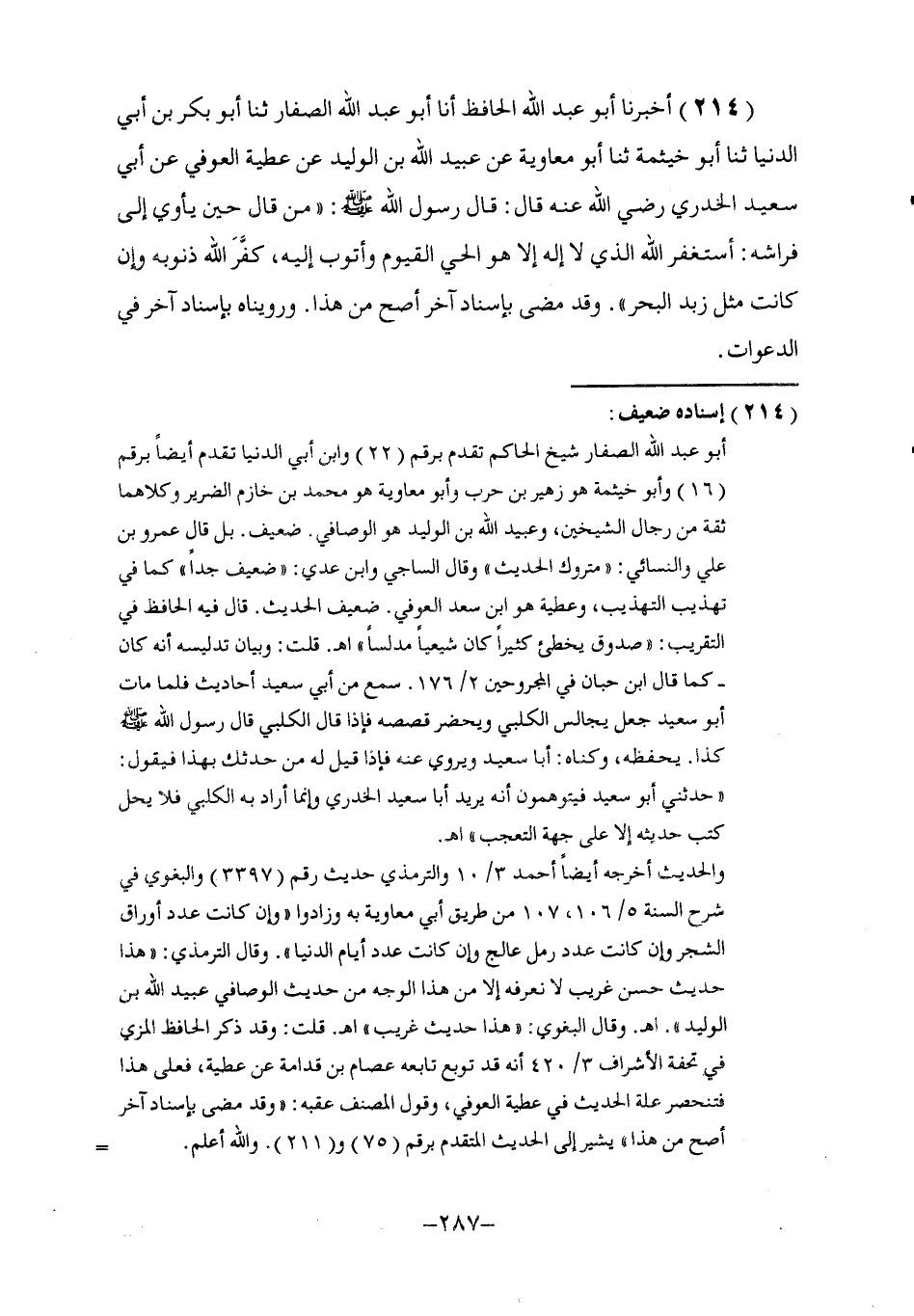 214 - أَخْبَرَنَا أَبُو عَبْدِ اللَّهِ الْحَافِظُ , أنا أَبُو عَبْدِ اللَّهِ الصَّفَّارُ , ثنا أَبُو بَكْرِ بْنُ أَبِي الدُّنْيَا , ثنا أَبُو خَيْثَمَةَ , ثنا أَبُو مُعَاوِيَةَ , عَنْ عُبَيْدِ اللَّهِ بْنِ الْوَلِيدِ , عَنْ عَطِيَّةَ الْعَوْفِيِّ , عَنْ أَبِي سَعِيدٍ الْخُدْرِيِّ , رَضِيَ اللَّهُ عَنْهُ قَالَ: قَالَ رَسُولُ اللَّهِ صَلَّى اللهُ عَلَيْهِ وَسَلَّمَ: " §مَنْ قَالَ حِينَ يَأْوِي إِلَى فِرَاشِهِ: أَسْتَغْفِرُ اللَّهَ الَّذِي لَا إِلَهَ إِلَّا هُوَ الْحَيُّ الْقَيُّومُ وَأَتُوبُ إِلَيْهِ , كَفَّرَ اللَّهُ ذُنُوبَهُ وَإِنْ كَانَتْ مِثْلَ زَبَدِ الْبَحْرِ " وَقَدْ مَضَى بِإِسْنَادٍ آخَرَ أَصَحَّ مِنْ هَذَا وَرُوِّينَاهُ بِإِسْنَادٍ آخَرَ فِي الدَّعَوَاتِ