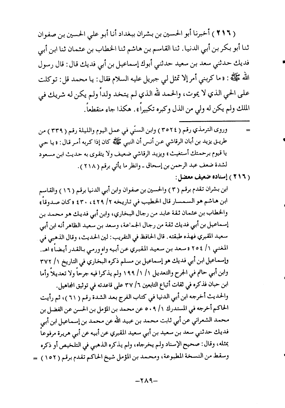216 - أَخْبَرَنَا أَبُو الْحُسَيْنِ بْنُ بِشْرَانَ , بِبَغْدَادَ , أنا أَبُو عَلِيٍّ الْحُسَيْنُ بْنُ صَفْوَانَ , ثنا أَبُو بَكْرِ بْنُ أَبِي الدُّنْيَا , ثنا الْقَاسِمُ بْنُ هَاشِمٍ , ثنا الْخَطَّابُ بْنُ عُثْمَانَ , ثنا ابْنُ أَبِي فُدَيْكٍ , حَدَّثَنِي سَعْدُ بْنُ سَعِيدٍ , حَدَّثَنِي أَبُوكَ , إِسْمَاعِيلُ بْنُ أَبِي فُدَيْكٍ قَالَ: قَالَ رَسُولُ اللَّهِ صَلَّى اللهُ عَلَيْهِ وَسَلَّمَ: §" مَا كَرَبَنِي أَمْرٌ إِلَّا تَمَثَّلَ لِي جِبْرِيلُ عَلَيْهِ السَّلَامُ فَقَالَ: يَا مُحَمَّدُ قُلْ: تَوَكَّلْتُ عَلَى الْحَيِّ الَّذِي لَا يَمُوتُ , وَالْحَمْدُ لِلَّهِ الَّذِي لَمْ يَتَّخِذْ وَلَدًا وَلَمْ يَكُنْ لَهُ شَرِيكٌ فِي الْمُلْكِ وَلَمْ يَكُنْ لَهُ وَلِيُّ مِنَ الذُّلِّ وَكَبِّرْهُ تَكْبِيرًا " هَكَذَا جَاءَ مُنْقَطِعًا
