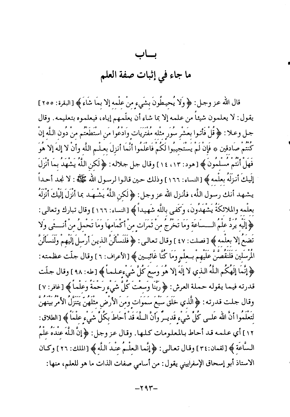 §بَابُ مَا جَاءَ فِي إِثْبَاتِ صِفَةِ الْعِلْمِ قَالَ اللَّهُ عَزَّ وَجَلَّ: {وَلَا يُحِيطُونَ بِشَيْءٍ مِنْ عِلْمِهِ إِلَّا بِمَا شَاءَ} [البقرة: 255] يَقُولُ: لَا يَعْلَمُونَ شَيْئًا مِنْ عِلْمِهِ إِلَّا بِمَا شَاءَ أَنْ يُعَلِّمَهُمْ إِيَّاهُ , فَيَعْلَمُوهُ بِتَعْلِيمِهِ وَقَالَ جَلَّ وَعَلَا: {قُلْ فَأْتُوا بِعَشْرِ سُوَرٍ مِثْلِهِ مُفْتَرَيَاتٍ وَادْعُوا مَنِ اسْتَطَعْتُمْ مِنْ دُونِ اللَّهِ إِنْ كُنْتُمْ صَادِقِينَ فَإِنْ لَّمْ يَسْتَجِيبُوا لَكُمْ فَاعْلَمُوا أَنَّمَا أُنْزِلَ بِعِلْمِ اللَّهِ وَأَنْ لَا إِلَهَ إِلَّا هُوَ فَهَلْ أَنْتُمْ مُسْلِمُونَ} [هود: 14] وَقَالَ جَلَّ جَلَالُهُ: {لَكِنِ اللَّهُ يَشْهَدُ بِمَا أَنْزَلَ إِلَيْكَ أَنْزَلَهُ بِعِلْمِهِ} [النساء: 166] وَذَلِكَ حِينَ قَالُوا لِرَسُولِ اللَّهِ صَلَّى اللهُ عَلَيْهِ وَسَلَّمَ: لَا نَجِدُ أَحَدًا يَشْهَدُ أَنَّكَ رَسُولُ اللَّهِ , فَأَنْزَلَ اللَّهُ عَزَّ وَجَلَّ: {لَكِنِ اللَّهُ يَشْهَدُ بِمَا أَنْزَلَ إِلَيْكَ أَنْزَلَهُ بِعِلْمِهِ وَالْمَلَائِكَةُ يَشْهَدُونَ وَكَفَى بِاللَّهِ شَهِيدًا} [النساء: 166] وَقَالَ تَبَارَكَ وَتَعَالَى: {إِلَيْهِ يُرَدُّ عِلْمُ السَّاعَةِ وَمَا تَخْرُجُ مِنْ ثَمَرَاتٍ مِنْ أَكْمَامِهَا وَمَا تَحْمِلُ مِنْ أُنْثَى وَلَا تَضَعُ إِلَّا بِعِلْمِهِ} [فصلت: 47] وَقَالَ تَعَالَى: {فَلَنَسْأَلَنَّ الَّذِينَ أُرْسِلَ إِلَيْهِمْ وَلَنَسْأَلَنَّ الْمُرْسَلِينَ فَلَنَقُصَّنَّ عَلَيْهِمْ بِعِلْمٍ وَمَا كُنَّا غَائِبِينَ} [الأعراف: 6] وَقَالَ جَلَّتْ عَظَمَتُهُ: {إِنَّمَا إِلَهُكُمُ اللَّهُ الَّذِي لَا إِلَهَ إِلَّا هُوَ وَسِعَ كُلَّ شَيْءٍ عِلْمًا} [طه: 98] وَقَالَ جَلَّتْ قُدْرَتُهُ فِيمَا يَقُولُهُ حَمَلَةُ الْعَرْشِ: {رَبَّنَا وَسِعْتَ كُلَّ شَيْءٍ رَحْمَةً وَعِلْمًا} [غافر: 7] وَقَالَ جَلَّتْ قُدْرَتُهُ: {الَّذِي خَلَقَ سَبْعَ سَمَوَاتٍ وَمِنَ الْأَرْضِ مِثْلَهُنَّ يَتَنَزَّلُ الْأَمْرُ بَيْنَهُنَّ لِتَعْلَمُوا أَنَّ اللَّهَ عَلَى كُلِّ شَيْءٍ قَدِيرٌ وَأَنَّ اللَّهَ قَدْ أَحَاطَ بِكُلِّ شَيْءٍ عِلْمًا} أَيْ عِلْمُهُ قَدْ أَحَاطَ بِالْمَعْلُومَاتِ كُلِّهَا وَقَالَ عَزَّ وَجَلَّ: {إِنَّ اللَّهَ عِنْدَهُ عِلْمُ السَّاعَةِ} [لقمان: 34] وَقَالَ تَعَالَى: {إِنَّمَا الْعِلْمُ عِنْدَ اللَّهِ} [الأحقاف: 23] وَكَانَ الْأُسْتَاذُ أَبُو إِسْحَاقَ الْإِسْفِرَايِينِيُّ يَقُولُ: مِنْ أَسَامِي صِفَاتِ الذَّاتِ مَا هُوَ لِلْعِلْمِ , مِنْهَا: «