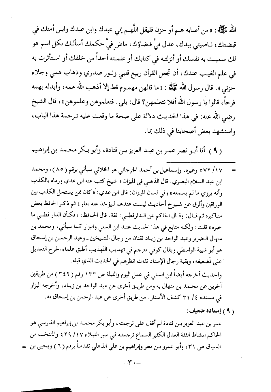 9 - أنا أَبُو نَصْرٍ عُمَرُ بْنُ عَبْدِ الْعَزِيزِ بْنِ قَتَادَةَ , وَأَبُو بَكْرٍ مُحَمَّدُ بْنُ إِبْرَاهِيمَ -[31]- الْفَارِسِيُّ قَالَا: أنا أَبُو عَمْرِو بْنُ مَطَرٍ , نا إِبْرَاهِيمُ بْنُ عَلِيٍّ الذُّهْلِيُّ , نا يَحْيَى بْنِ يَحْيَى , أنا صَالِحٌ الْمُرِّيُّ , عَنْ جَعْفَرِ بْنِ زَيْدٍ الْعَبْدِيِّ , عَنْ عَائِشَةَ أُمِّ الْمُؤْمِنِينَ , أَنَّهَا قَالَتْ: يَا رَسُولَ اللَّهِ عَلِّمْنِي §اسْمَ اللَّهِ الَّذِي إِذَا دُعِيَ بِهِ أَجَابَ قَالَ لَهَا صَلَّى اللهُ عَلَيْهِ وَسَلَّمَ: «قَوْمِي فَتَوَضَّئِي وَادْخُلِي الْمَسْجِدَ فَصَلِّي رَكْعَتَيْنِ , ثُمَّ ادْعِي حَتَّى أَسْمَعَ» فَفَعَلْتُ , فَلَمَّا جَلَسْتُ لِلدُّعَاءِ قَالَ النَّبِيُّ صَلَّى اللهُ عَلَيْهِ وَسَلَّمَ: «اللَّهُمَّ وَفِّقْهَا» فَقَالَتِ: اللَّهُمَّ إِنِّي أَسْأَلُكَ بِجَمِيعِ أَسْمَائِكَ الْحُسْنَى كُلِّهَا , مَا عَلِمْنَا مِنْهَا وَمَا لَمْ نَعْلَمْ , وَأَسْأَلُكَ بِاسْمِكَ الْعَظِيمِ الْأَعْظَمِ , الْكَبِيرِ الْأَكْبَرِ , وَالَّذِي مَنْ دَعَاكَ بِهِ أَجَبْتَهُ , وَمَنْ سَأَلَكَ بِهِ أَعْطَيْتَهُ قَالَ: يَقُولُ النَّبِيُّ صَلَّى اللهُ عَلَيْهِ وَسَلَّمَ: «أَصَبْتِهِ أَصَبْتِهِ»