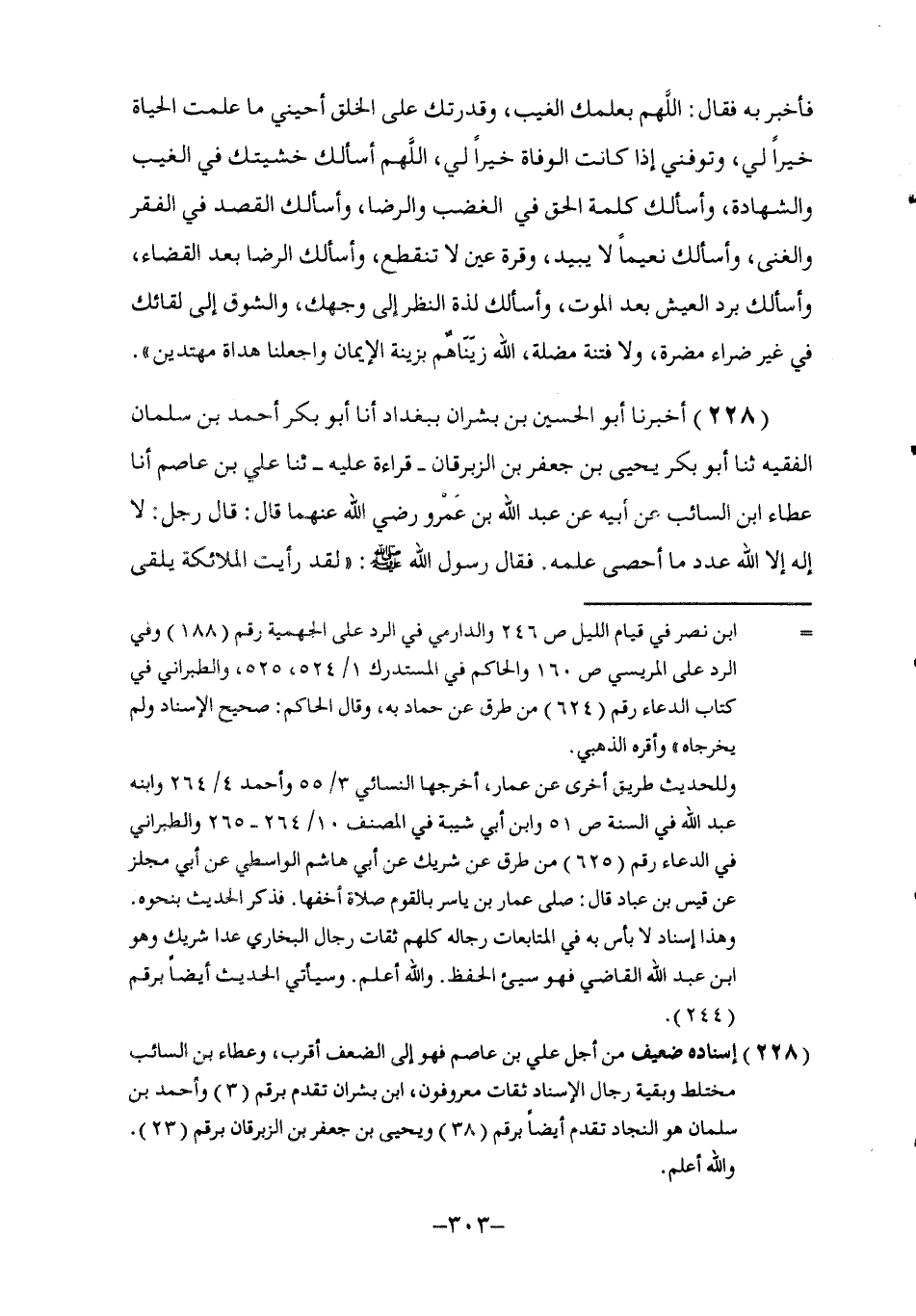 228 - أَخْبَرَنَا أَبُو الْحُسَيْنِ بْنُ بِشْرَانَ , بِبَغْدَادَ , أنا أَبُو بَكْرٍ أَحْمَدُ بْنُ سَلْمَانَ الْفَقِيهُ , ثنا أَبُو بَكْرٍ يَحْيَى بْنُ جَعْفَرِ بْنِ الزِّبْرِقَانَ قِرَاءَةً عَلَيْهِ، ثنا عَلِيُّ بْنُ عَاصِمٍ , أنا عَطَاءُ بْنُ السَّائِبِ , عَنْ أَبِيهِ , عَنْ عَبْدِ اللَّهِ بْنِ عَمْرٍو , رَضِيَ اللَّهُ عَنْهُمَا , قَالَ: قَالَ رَجُلٌ لَا إِلَهَ إِلَّا اللَّهُ عَدَدَ مَا أَحْصَى عِلْمُهُ , فَقَالَ رَسُولُ اللَّهِ صَلَّى اللهُ عَلَيْهِ وَسَلَّمَ: §" لَقَدْ رَأَيْتُ الْمَلَائِكَةَ يَلْقَى -[304]- بَعْضُهُا بَعْضًا أَيُّهُمْ يَسْبِقُ إِلَيْهَا فَيَكْتُبَهَا فَقَالَتِ الْمَلَائِكَةُ: يَا رَبِّ كَيْفَ نَكْتُبُهَا؟ فَقَالَ عَزَّ وَجَلَّ: اكْتُبُوهَا كَمَا قَالَ عَبْدِي "