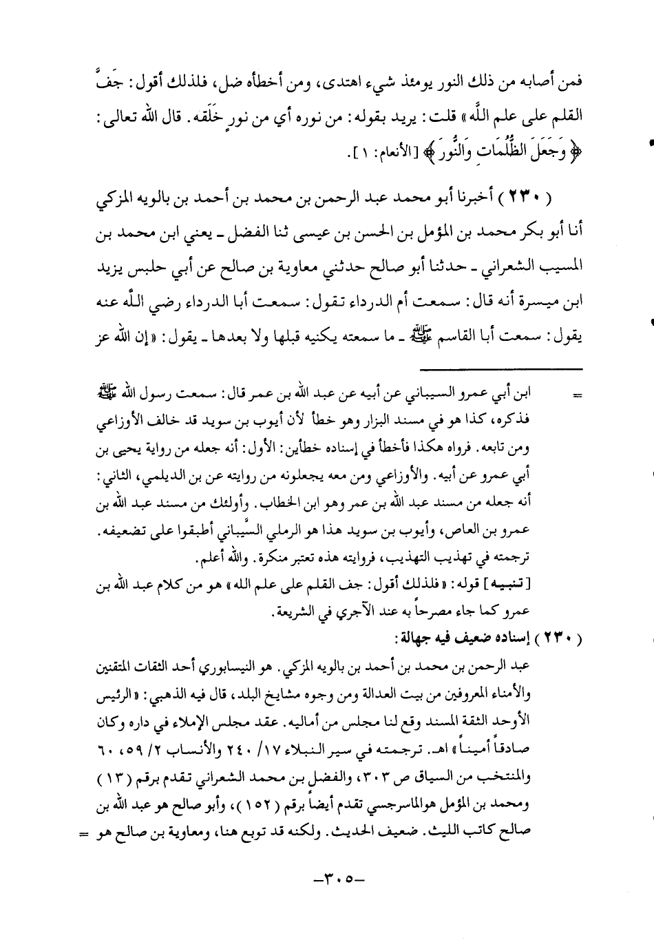 230 - أَخْبَرَنَا أَبُو مُحَمَّدٍ عَبْدُ الرَّحْمَنِ بْنِ مُحَمَّدِ بْنِ أَحْمَدَ بْنِ بَالَوَيْهِ الْمُزَكِّي , أنا أَبُو بَكْرٍ مُحَمَّدُ بْنُ الْمُؤَمَّلِ بْنِ الْحَسَنِ بْنِ عِيسَى , ثنا الْفَضْلُ , يَعْنِي ابْنَ مُحَمَّدِ بْنِ الْمُسَيَّبِ الشَّعْرَانِيَّ حَدَّثَنَا أَبُو صَالِحٍ , حَدَّثَنِي مُعَاوِيَةُ بْنُ صَالِحٍ , عَنْ أَبِي حَلْبَسٍ يَزِيدَ بْنِ مَيْسَرَةَ أَنَّهُ قَالَ: سَمِعْتُ أُمَّ الدَّرْدَاءِ , تَقُولُ: سَمِعْتُ أَبَا الدَّرْدَاءِ , رَضِيَ اللَّهُ عَنْهُ يَقُولُ: سَمِعْتُ أَبَا الْقَاسِمِ , صَلَّى اللهُ عَلَيْهِ وَسَلَّمَ، مَا سَمِعْتُهُ يُكَنِّيهِ قَبْلَهَا وَلَا بَعْدَهَا، يَقُولُ: " إِنَّ اللَّهَ عَزَّ -[306]- وَجَلَّ قَالَ: يَا عِيسَى ابْنَ مَرْيَمَ، §إِنِّي بَاعِثٌ بَعْدَكَ أُمَّةً إِنْ أَصَابَهُمْ مَا يُحِبُّونَ حَمِدُوا وَشَكَرُوا وَإِنْ أَصَابَهُمْ مَا يَكْرَهُونَ احْتَسَبُوا وَصَبَرُوا , وَلَا حِلْمَ وَلَا عِلْمَ , قَالَ: يَا رَبِّ وَكَيْفَ يَكُونُ هَذَا لَهُمْ وَلَا حِلْمَ وَلَا عِلْمَ؟ قَالَ: أُعْطِيهِمْ مِنْ حِلْمِي وَعِلْمِي "