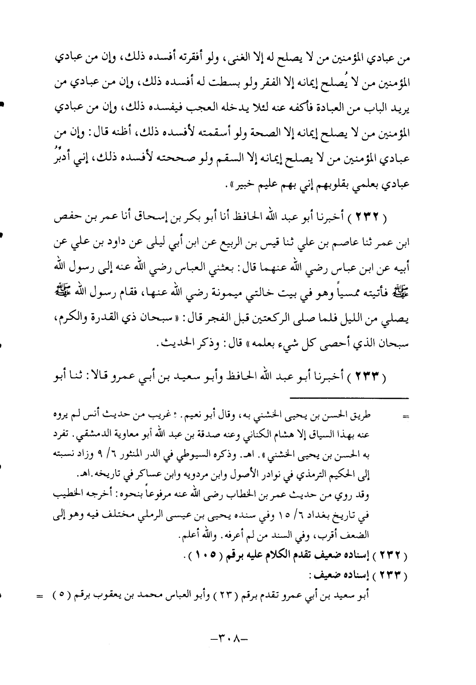 232 - أَخْبَرَنَا أَبُو عَبْدِ اللَّهِ الْحَافِظُ , أنا أَبُو بَكْرِ بْنُ إِسْحَاقَ , أنا عُمَرُ بْنُ حَفْصِ بْنِ عُمَرَ , ثنا عَاصِمُ بْنُ عَلِيٍّ , ثنا قَيْسُ بْنُ الرَّبِيعِ , عَنِ ابْنِ أَبِي لَيْلَى , عَنْ دَاوُدَ بْنِ عَلِيٍّ , عَنْ أَبِيهِ , عَنِ ابْنِ عَبَّاسٍ , رَضِيَ اللَّهُ عَنْهُمَا قَالَ: بَعَثَنِي الْعَبَّاسُ رَضِيَ اللَّهُ عَنْهُ إِلَى رَسُولِ اللَّهِ صَلَّى اللهُ عَلَيْهِ وَسَلَّمَ فَأَتَيْتُهُ مُمْسِيًا وَهُوَ فِي بَيْتِ خَالَتِي مَيْمُونَةَ رَضِيَ اللَّهُ عَنْهَا , فَقَامَ رَسُولُ اللَّهِ صَلَّى اللهُ عَلَيْهِ وَسَلَّمَ يُصَلِّي مِنَ اللَّيْلِ فَلَمَّا صَلَّى الرَّكْعَتَيْنِ قَبْلَ الْفَجْرِ , قَالَ: §«سُبْحَانَ ذِي الْقُدْرَةِ وَالْكَرَمِ سُبْحَانَ الَّذِي أَحْصَى كُلَّ شَيْءٍ بِعِلْمِهِ» قَالَ: وَذَكَرَ الْحَدِيثَ