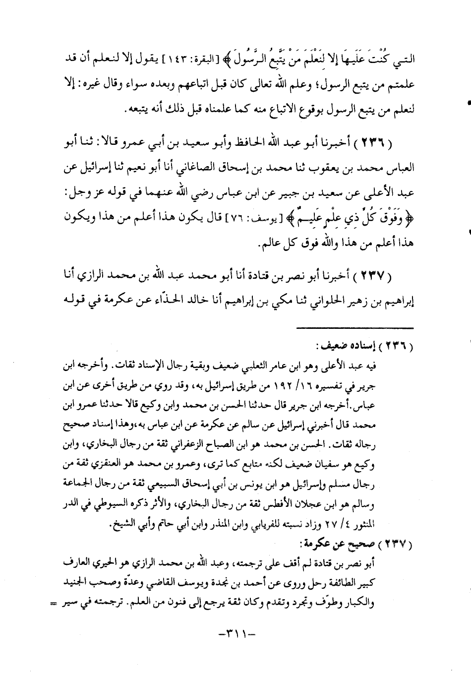 236 - أَخْبَرَنَا أَبُو عَبْدِ اللَّهِ الْحَافِظُ , وَأَبُو سَعِيدِ بْنُ أَبِي عَمْرٍو , قَالَا: ثنا أَبُو الْعَبَّاسِ مُحَمَّدُ بْنُ يَعْقُوبَ , ثَنَا مُحَمَّدُ بْنُ إِسْحَاقَ الصَّاغَانِيُّ , أنا أَبُو نُعَيْمٍ , ثنا إِسْرَائِيلُ , عَنْ عَبْدِ الْأَعْلَى , عَنْ سَعِيدِ بْنِ جُبَيْرٍ , عَنِ ابْنِ عَبَّاسٍ , رَضِيَ اللَّهُ عَنْهُمَا فِي قَوْلِهِ عَزَّ وَجَلَّ: {§وَفَوْقَ كُلِّ ذِي عِلْمٍ عَلِيمٌ} [يوسف: 76] قَالَ: يَكُونُ هَذَا أَعْلَمُ مِنْ هَذَا وَيَكُونُ هَذَا أَعْلَمُ مِنْ هَذَا وَاللَّهُ فَوْقَ كُلِّ عَالِمٍ
