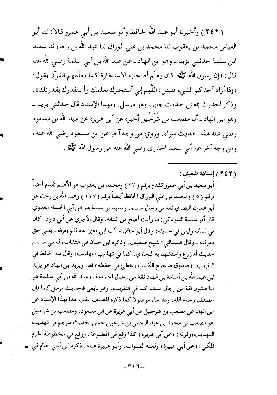 242 - وَأَخْبَرَنَا أَبُو عَبْدِ اللَّهِ الْحَافِظُ , وَأَبُو سَعِيدِ بْنُ أَبِي عَمْرٍو قَالَا: ثنا أَبُو الْعَبَّاسِ مُحَمَّدُ بْنُ يَعْقُوبَ , ثنا مُحَمَّدُ بْنُ عَلِيٍّ الْوَرَّاقُ , ثنا عَبْدُ اللَّهِ بْنُ رَجَاءٍ , ثنا سَعِيدُ بْنُ سَلَمَةَ , حَدَّثَنِي يَزِيدُ , وَهُوَ ابْنُ الْهَادِ عَنْ عَبْدِ اللَّهِ بْنِ أَبِي سَلْمَةَ , رَضِيَ اللَّهُ عَنْهُ قَالَ: إِنَّ رَسُولَ اللَّهِ صَلَّى اللهُ عَلَيْهِ وَسَلَّمَ كَانَ §يُعَلِّمُ أَصْحَابَهُ الِاسْتِخَارَةَ كَمَا يُعَلِّمُهُمُ الْقُرْآنَ يَقُولُ: " إِذَا أَرَادَ أَحَدُكُمُ الشَّيْءَ فَلْيَقُلِ: اللَّهُمَّ إِنِّي أَسْتَخِيرُكَ بِعِلْمِكَ وَأَسْتَقْدِرُكَ بِقُدْرَتِكَ " وَذَكَرَ الْحَدِيثَ بِمَعْنَى حَدِيثِ جَابِرٍ , وَهُوَ مُرْسَلٌ وَبِهَذَا الْإِسْنَادِ قَالَ حَدَّثَنِي يَزِيدُ وَهُوَ ابْنُ الْهَادِ أَنَّ مُصْعَبَ بْنَ شُرَحْبِيلَ أَخْبَرَهُ عَنْ أَبِي هُرَيْرَةَ عَنْ عَبْدِ اللَّهِ بْنِ مَسْعُودٍ رَضِيَ اللَّهُ عَنْهُ هَذَا الْحَدِيثَ سَوَاءً وَرُوِيَ مِنْ وَجْهٍ آخَرَ عَنِ ابْنِ مَسْعُودٍ رَضِيَ اللَّهُ عَنْهُ وَمِنْ وَجْهٍ آخَرَ عَنْ أَبِي سَعِيدٍ الْخُدْرِيِّ رَضِيَ اللَّهُ عَنْهُ عَنْ رَسُولِ اللَّهِ صَلَّى اللهُ عَلَيْهِ وَسَلَّمَ