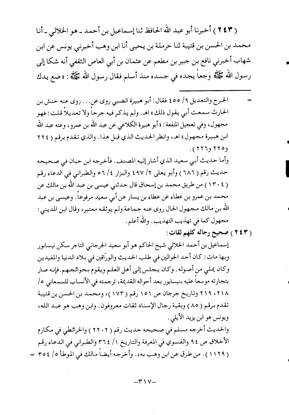 243 - أَخْبَرَنَا أَبُو عَبْدِ اللَّهِ الْحَافِظُ , ثنا إِسْمَاعِيلُ بْنُ أَحْمَدَ , هُوَ الْخِلَالِيُّ أنا مُحَمَّدُ بْنُ الْحَسَنِ بْنِ قُتَيْبَةَ , ثنا حَرْمَلَةُ بْنُ يَحْيَى , أنا ابْنُ وَهْبٍ , أَخْبَرَنِي يُونُسُ , عَنِ ابْنِ شِهَابٍ , أَخْبَرَنِي نَافِعُ بْنُ جُبَيْرِ بْنِ مُطْعِمٍ , عَنْ عُثْمَانَ بْنِ أَبِي الْعَاصِ الثَّقَفِيِّ , أَنَّهُ شَكَا إِلَى رَسُولِ اللَّهِ صَلَّى اللهُ عَلَيْهِ وَسَلَّمَ وَجَعًا يَجِدُهُ فِي جَسَدِهِ مُنْذُ أَسْلَمَ فَقَالَ رَسُولُ اللَّهِ صَلَّى اللهُ عَلَيْهِ وَسَلَّمَ: " ضَعْ يَدَكَ -[318]- عَلَى الَّذِي يَأْلَمُ مِنْ جَسَدِكِ وَقُلْ: §بِسْمِ اللَّهِ ثَلَاثًا وَقُلْ سَبْعَ مَرَّاتٍ أَعُوذُ بِاللَّهِ وَقُدْرَتِهِ مِنْ شَرِّ مَا أَجِدُ وَأُحَاذِرُ " رَوَاهُ مُسْلِمٌ فِي الصَّحِيحِ عَنْ حَرْمَلَةَ