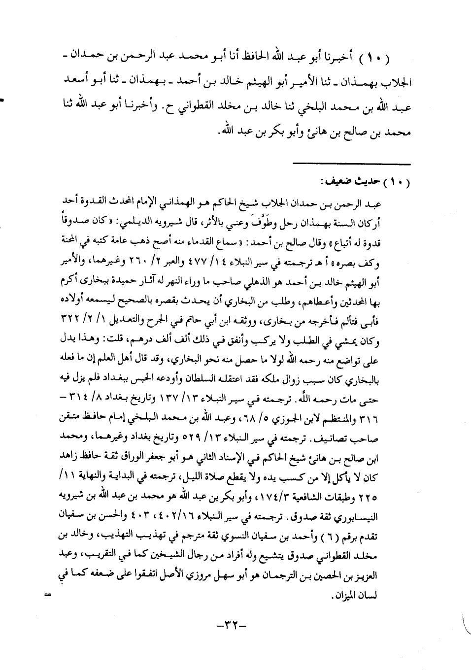 10 - أَخْبَرَنَا أَبُو عَبْدِ اللَّهِ الْحَافِظُ , أنا أَبُو مُحَمَّدٍ عَبْدُ الرَّحْمَنِ بْنُ حَمْدَانَ الْجَلَّابُ بِهَمَذَانَ ثنا الْأَمِيرُ أَبُو الْهَيْثَمِ خَالِدُ بْنُ أَحْمَدَ بِهَمَذَانَ ثنا أَبُو أَسْعَدٍ عَبْدُ اللَّهِ بْنُ مُحَمَّدٍ الْبَلْخِيُّ , ثنا خَالِدُ بْنُ مَخْلَدٍ الْقَطَوَانِيُّ , ح وَأَخْبَرَنَا أَبُو عَبْدِ اللَّهِ ثنا مُحَمَّدُ بْنُ صَالِحِ بْنِ هَانِئٍ , وَأَبُو بَكْرُ بْنُ عَبْدِ اللَّهِ -[33]- قَالَا: ثنا الْحَسَنُ بْنُ سُفْيَانَ , ثنا أَحْمَدُ بْنُ سُفْيَانَ النَّسَوِيِّ , ثنا خَالِدُ بْنُ مَخْلَدٍ , ثنا عَبْدُ الْعَزِيزِ الْحُصَيْنُ بْنُ التُّرْجُمَانِ , ثنا أَيُّوبُ السَّخْتِيَانِيُّ , وَهِشَامُ بْنُ حَسَّانَ , عَنْ مُحَمَّدِ بْنِ سِيرِينَ , عَنْ أَبِي هُرَيْرَةَ , رَضِيَ اللَّهُ عَنْهُ عَنِ النَّبِيِّ صَلَّى اللهُ عَلَيْهِ وَسَلَّمَ قَالَ: §«إِنَّ لِلَّهِ تَعَالَى تِسْعَةً وَتِسْعِينَ اسْمًا مَنْ أَحْصَاهَا دَخَلَ الْجَنَّةَ» , فَذَكَرَهَا وَعَدَّ مِنْهَا: «الْإِلَهُ الرَّبُّ الْحَنَّانُ الْمَنَّانُ الْبَارِي الْأَحَدُ الْكَافِي الدَّائِمُ الْمَوْلَى النَّصِيرُ الْمُبِينُ الْجَمِيلُ الصَّادِقُ الْمُحِيطُ الْقَرِيبُ الْقَدِيمُ الْوِتْرُ الْفَاطِرُ الْعَلَّامُ الْمَلِيكُ الْأَكْرَمُ الْمُدَبِّرُ الْقَدِيرُ الشَّاكِرُ ذُو الطَّوْلِ ذُو الْمَعَارِجِ ذُو الْفَضْلِ الْكَفِيلُ» تَفَرَّدَ بِهَذِهِ الرِّوَايَةِ عَبْدُ الْعَزِيزِ بْنُ الْحُصَيْنِ بْنِ التُّرْجُمَانِ وَهُوَ ضَعِيفُ الْحَدِيثِ عِنْدَ أَهْلِ النَّقْلِ ضَعَّفَهُ يَحْيَى بْنُ مَعِينٍ وَمُحَمَّدُ بْنُ إِسْمَاعِيلَ الْبُخَارِيُّ , وَيُحْتَمَلُ أَنْ يَكُونَ التَّفْسِيرُ وَقَعَ مِنْ بَعْضِ الرُّوَاةِ , وَكَذَلِكَ فِي حَدِيثِ الْوَلِيدِ بْنِ مُسْلِمٍ , وَلِهَذَا الِاحْتِمَالِ تَرَكَ الْبُخَارِيُّ وَمُسْلِمٌ إِخْرَاجَ حَدِيثِ الْوَلِيدِ فِي الصَّحِيحِ , فَإِنْ كَانَ مَحْفُوظًا عَنِ النَّبِيِّ صَلَّى اللهُ عَلَيْهِ وَسَلَّمَ فَكَأَنَّهُ قَصَدَ أَنَّ مَنْ أَحْصَى مِنْ أَسْمَاءِ اللَّهِ تَعَالَى تِسْعَةً وَتِسْعِينَ اسْمًا دَخَلَ الْجَنَّةَ , سَوَاءً أَحْصَاهَا مِمَّا نَقَلْنَا فِي حَدِيثِ الْوَلِيدِ بْنِ مُسْلِمٍ أَوْ مِمَّا نَقَلْنَاهُ فِي حَدِيثِ عَبْدِ الْعَزِيزِ بْنِ الْحُصَيْنِ , أَوْ مِنْ سَائِرِ مَا دَلَّ عَلَيْهِ الْكِتَابُ وَالسُّنَّةُ وَاللَّهُ أَعْلَمُ، وَهَذِهِ الْأَسَامِي كُلُّهَا فِي كِتَابِ اللَّهِ تَعَالَى وَفِي سَائِرِ أَحَادِيثِ رَسُولِ اللَّهِ صَلَّى اللهُ عَلَيْهِ وَسَلَّمَ -[34]- نَصًّا أَوْ دَلَالَةً وَنَحْنُ نُشِيرُ إِلَى مَوَاضِعِهَا إِنْ شَاءَ اللَّهُ تَعَالَى فِي جِمَاعِ أَبْوَابِ مَعَانِي هَذِهِ الْأَسْمَاءِ , وَنُضِيفُ إِلَيْهَا مَا لَمْ يَدْخُلْ فِي جُمْلَتِهَا بِمَشِيئَةِ اللَّهِ تَعَالَى وَحُسْنِ تَوْفِيقِهِ