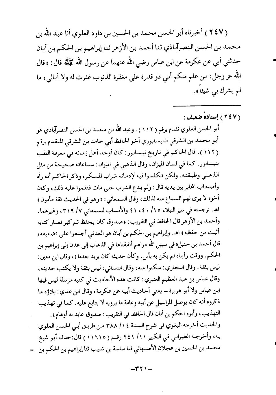 247 - أَخْبَرَنَاهُ أَبُو الْحَسَنِ مُحَمَّدُ بْنُ الْحُسَيْنِ بْنِ دَاوُدَ الْعَلَوِيُّ , أنا عَبْدُ اللَّهِ بْنُ مُحَمَّدِ بْنِ الْحَسَنِ النَّصْرَآبَاذِي , ثنا أَحْمَدُ بْنُ الْأَزْهَرِ , ثنا إِبْرَاهِيمُ بْنُ الْحَكَمِ بْنِ أَبَانَ , حَدَّثَنِي أَبِي , عَنْ عِكْرِمَةَ , عَنِ ابْنِ عَبَّاسٍ , رَضِيَ اللَّهُ عَنْهُمَا عَنْ رَسُولِ اللَّهِ صَلَّى اللهُ عَلَيْهِ وَسَلَّمَ قَالَ: " §قَالَ اللَّهُ عَزَّ وَجَلَّ: مَنْ عَلِمَ مِنْكُمْ أَنِّي ذُو قُدْرَةٍ عَلَى مَغْفِرَةِ الذُّنُوبِ غَفَرْتُ لَهُ وَلَا أُبَالِي , مَا لَمْ يُشْرِكْ بِي شَيْئًا "