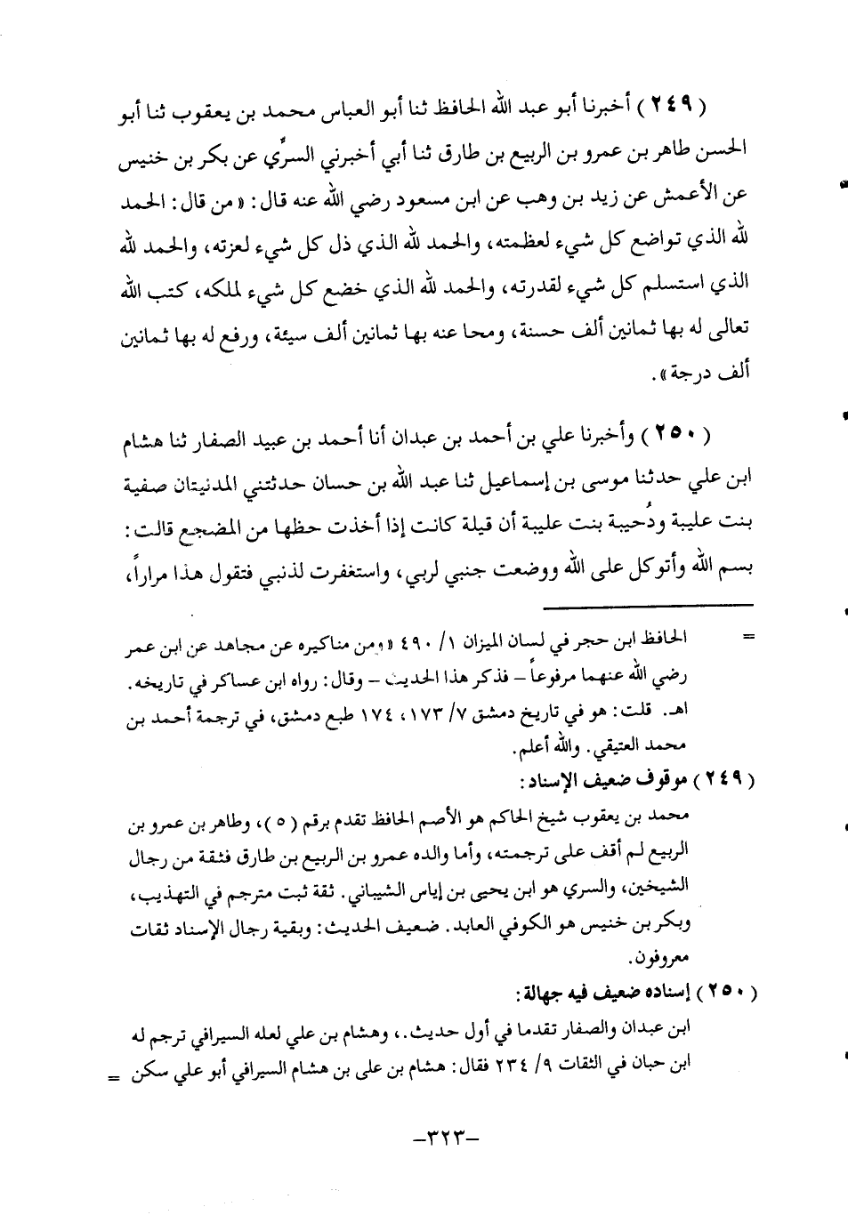 249 - أَخْبَرَنَا أَبُو عَبْدِ اللَّهِ الْحَافِظُ , ثنا أَبُو الْعَبَّاسِ مُحَمَّدُ بْنُ يَعْقُوبَ , ثنا أَبُو الْحَسَنِ طَاهِرُ بْنُ عَمْرِو بْنِ الرَّبِيعِ بْنِ طَارِقٍ , ثنا أَبِي , أَخْبَرَنِي السَّرِيُّ , عَنْ بَكْرِ بْنِ خُنَيْسٍ , عَنِ الْأَعْمَشِ , عَنْ زَيْدِ بْنِ وَهْبٍ , عَنِ ابْنِ مَسْعُودٍ , رَضِيَ اللَّهُ عَنْهُ قَالَ: مَنْ قَالَ: §الْحَمْدُ لِلَّهِ الَّذِي تَوَاضَعَ كُلُّ شَيْءٍ لِعَظَمَتِهِ , وَالْحَمْدُ لِلَّهِ الَّذِي ذَلَّ كُلُّ شَيْءٍ لِعِزَّتِهِ , وَالْحَمْدُ لِلَّهِ الَّذِي اسْتَسْلَمَ كُلُّ شَيْءٍ لِقُدْرَتِهِ , وَالْحَمْدُ لِلَّهِ الَّذِي خَضَعَ كُلُّ شَيْءٍ لِمُلْكِهِ , كَتَبَ اللَّهُ تَعَالَى لَهُ بِهَا ثَمَانِينَ أَلْفَ حَسَنَةٍ , وَمَحَا عَنْهُ بِهَا ثَمَانِينَ أَلْفَ سَيِّئَةٍ وَرَفَعَ لَهُ بِهَا ثَمَانِينَ أَلْفَ دَرَجَةٍ