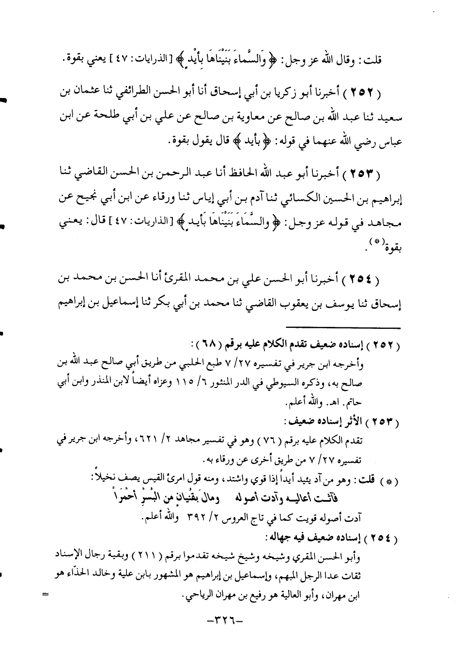 253 - أَخْبَرَنَا أَبُو عَبْدِ اللَّهِ الْحَافِظُ , أنا عَبْدُ الرَّحْمَنِ بْنُ الْحَسَنِ الْقَاضِي , ثنا إِبْرَاهِيمُ بْنُ الْحَسَنِ الْكِسَائِيُّ , ثنا آدَمُ بْنُ أَبِي إِيَاسٍ , ثنا وَرْقَاءُ عَنْ أَبِي نَجِيحٍ , عَنْ مُجَاهِدٍ , فِي قَوْلِهِ عَزَّ وَجَلَّ: {§وَالسَّمَاءَ بَنَيْنَاهَا بِأَيْدٍ} [الذاريات: 47] قَالَ: يَعْنِي بِقُوَّةٍ