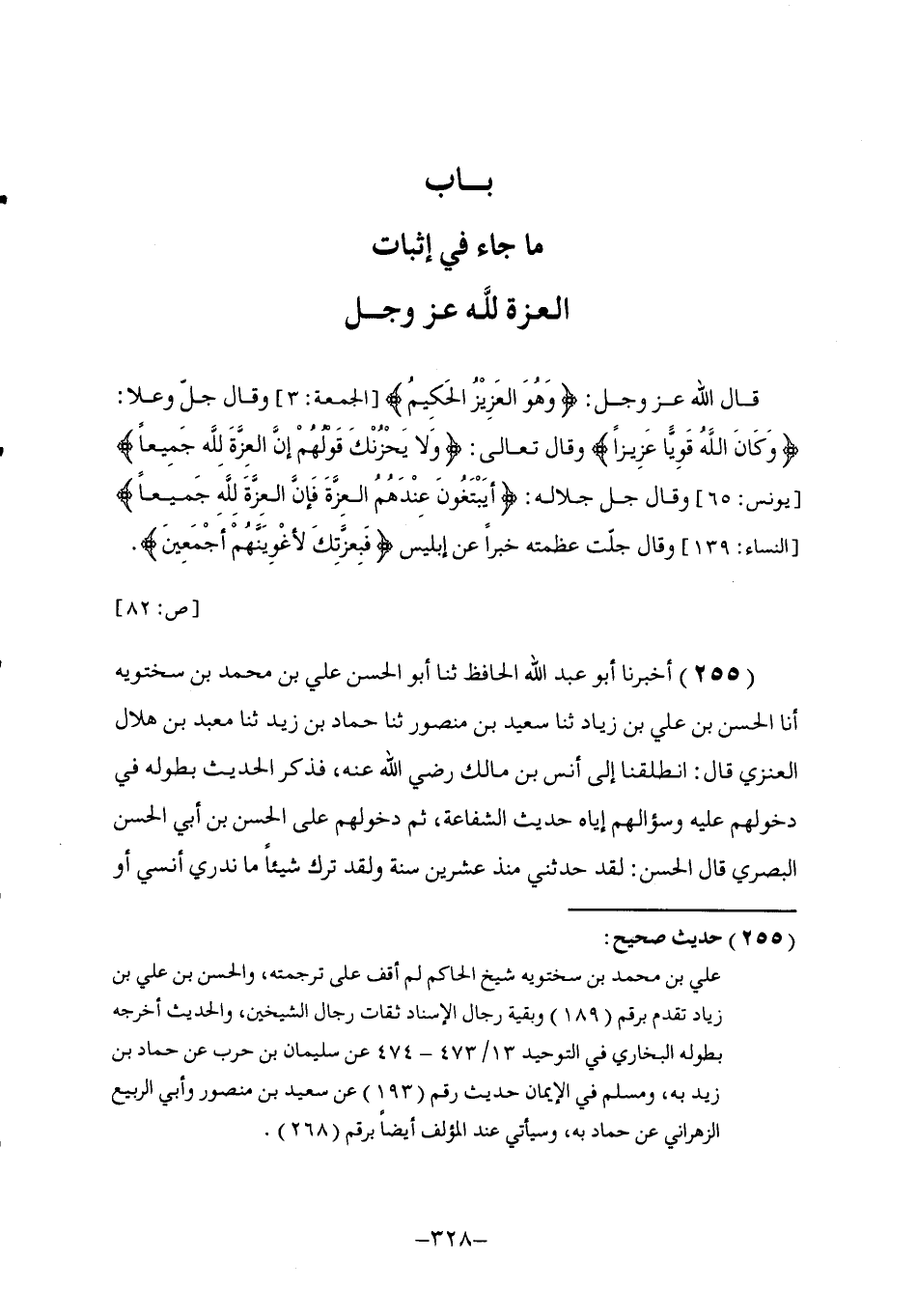 §بَابُ مَا جَاءَ فِي إِثْبَاتِ الْعِزَّةِ لِلَّهِ عَزَّ وَجَلَّ قَالَ اللَّهُ عَزَّ وَجَلَّ: {وَهُوَ الْعَزِيزُ الْحَكِيمُ} [إبراهيم: 4] وَقَالَ جَلَّ وَعَلَا {وَكَانَ اللَّهُ قَوِيًّا عَزِيزًا} [الأحزاب: 25] وَقَالَ تَعَالَى: {وَلَا يَحْزُنْكَ قَوْلُهُمْ إِنَّ الْعِزَّةَ لِلَّهِ جَمِيعًا} [يونس: 65] وَقَالَ جَلَّ جَلَالُهُ: {أَيَبْتَغُونَ عِنْدَهُمُ الْعِزَّةَ فَإِنَّ الْعِزَّةَ لِلَّهِ جَمِيعًا} [النساء: 139] وَقَالَ جَلَّتْ عَظَمَتُهُ خَبَرًا عَنْ إِبْلِيسَ: {فَبِعِزَّتِكَ لَأُغْوِيَنَّهُمْ أَجْمَعِينَ} [ص: 82]