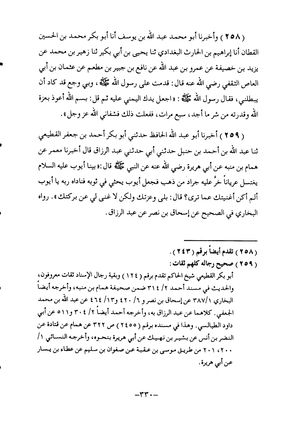 259 - أَخْبَرَنَا أَبُو عَبْدِ اللَّهِ الْحَافِظُ , حَدَّثَنِي أَبُو بَكْرٍ أَحْمَدُ بْنُ جَعْفَرٍ الْقَطِيعِيُّ , ثنا عَبْدُ اللَّهِ بْنُ أَحْمَدَ بْنِ حَنْبَلٍ , حَدَّثَنِي أَبِي , حَدَّثَنِي عَبْدُ الرَّزَّاقِ , قَالَ: أَخْبَرَنَا مَعْمَرٌ , عَنْ هَمَّامِ بْنِ مُنَبِّهٍ , عَنْ أَبِي هُرَيْرَةَ , رَضِيَ اللَّهُ عَنْهُ: عَنِ النَّبِيِّ صَلَّى اللهُ عَلَيْهِ وَسَلَّمَ قَالَ: §" بَيْنَا أَيُّوبُ عَلَيْهِ السَّلَامُ يَغْتَسِلُ عُرْيَانًا خَرَّ عَلَيْهِ جَرَادٌ مِنْ ذَهَبٍ فَجَعَلَ أَيُّوبُ يَحْثِي فِي ثَوْبِهِ، فَنَادَاهُ رَبُّهُ: يَا أَيُّوبُ، أَلَمْ أَكُنْ أَغْنَيْتُكَ عَمَّا تَرَى؟ قَالَ: بَلَى وَعِزَّتِكَ، وَلَكِنْ لَا غِنَى لِي عَنْ بَرَكَتِكَ " رَوَاهُ الْبُخَارِيُّ فِي الصَّحِيحِ عَنْ إِسْحَاقَ بْنِ نَصْرٍ عَنْ عَبْدِ الرَّزَّاقِ