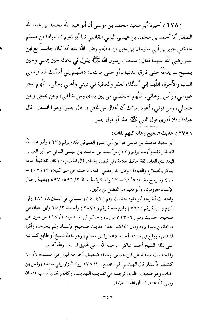 278 - أَخْبَرَنَا أَبُو سَعِيدٍ , مُحَمَّدُ بْنُ مُوسَى , أنا أَبُو عَبْدِ اللَّهِ مُحَمَّدُ بْنُ عَبْدِ اللَّهِ الصَّفَّارُ , أنا أَحْمَدُ بْنُ مُحَمَّدِ بْنِ عِيسَى الْبِرْتِيُّ الْقَاضِي , ثنا أَبُو نُعَيْمٍ , ثنا عُبَادَةُ بْنُ مُسْلِمٍ , حَدَّثَنِي جُبَيْرُ بْنُ أَبِي سُلَيْمَانَ بْنِ جُبَيْرِ بْنِ مُطْعِمٍ , رَضِيَ اللَّهُ عَنْهُ أَنَّهُ كَانَ جَالِسًا مَعَ ابْنِ عُمَرَ رَضِيَ اللَّهُ عَنْهُمَا فَقَالَ: سَمِعْتُ رَسُولَ اللَّهِ صَلَّى اللهُ عَلَيْهِ وَسَلَّمَ §يَقُولُ فِي دُعَائِهِ حِينَ يُمْسِي وَحِينَ يُصْبِحُ لَمْ يَدَعْهُ حَتَّى فَارَقَ الدُّنْيَا - أَوْ حَتَّى مَاتَ -: «اللَّهُمَّ إِنِّي أَسْأَلُكَ الْعَافِيَةَ فِي الدُّنْيَا وَالْآخِرَةِ , اللَّهُمَّ إِنِّي أَسْأَلُكَ الْعَفْوَ وَالْعَافِيَةَ فِي دِينِي وَأَهْلِي وَمَالِي , اللَّهُمَّ اسْتُرْ عَوْرَاتِي وَآمِنْ رَوْعَاتِي , اللَّهُمَّ احْفَظْنِي مِنْ بَيْنِ يَدَيَّ وَمِنْ خَلْفِي وَعَنْ يَمِينِي وَعَنْ شِمَالِي , وَمِنْ فَوْقِي أَعُوذُ بِعِزَّتِكَ أَنْ أُغْتَالَ مِنْ تَحْتِي» قَالَ جُبَيْرٌ: وَهُوَ الْخَسْفُ , قَالَ عُبَادَةُ: فَلَا أَدْرِي قَوْلَ النَّبِيِّ صَلَّى اللهُ عَلَيْهِ وَسَلَّمَ هَذَا أَوْ قَوْلَ جُبَيْرٍ