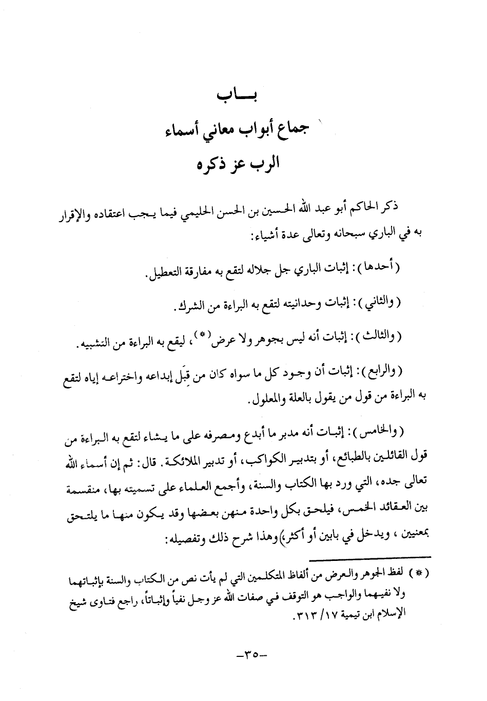 §بَابُ جِمَاعِ أَبْوَابِ مَعَانِي أَسْمَاءِ الرَّبِّ عَزَّ ذِكْرُهُ ذَكَرَ الْحَاكِمُ أَبُو عَبْدِ اللَّهِ الْحُسَيْنُ بْنُ الْحَسَنِ الْحَلِيمِيُّ فِيمَا يَجِبُ اعْتِقَادُهُ وَالْإِقْرَارُ بِهِ فِي الْبَارِي سُبْحَانَهُ وَتَعَالَى عِدَّةَ أَشْيَاءَ: أَحَدُهَا: إِثْبَاتُ الْبَارِي جَلَّ جَلَالُهُ لِتَقَعَ بِهِ مُفَارَقَةُ التَّعْطِيلِ وَالثَّانِي: إِثْبَاتُ وَحْدَانِيَّتِهِ لِتَقَعَ بِهِ الْبَرَاءَةُ مِنَ الشِّرْكِ وَالثَّالِثُ: إِثْبَاتُ أَنَّهُ لَيْسَ بِجَوْهَرٍ وَلَا عَرَضٍ لِيَقَعَ بِهِ الْبَرَاءَةُ مِنَ التَّشْبِيهِ وَالرَّابِعُ: إِثْبَاتُ أَنَّ وُجُودَ كُلِّ مَا سِوَاهُ كَانَ مِنْ قِبَلِ إِبْدَاعِهِ وَاخْتِرَاعِهِ إِيَّاهُ لِتَقَعَ بِهِ الْبَرَاءَةُ مِنْ قَوْلِ مَنْ يَقُولُ بِالْعِلَّةِ وَالْمَعْلُولِ وَالْخَامِسُ: إِثْبَاتُ أَنَّهُ مُدَبِّرُ مَا أَبْدَعَ وَمُصَرِّفُهُ عَلَى مَا يَشَاءُ لِتَقَعَ بِهِ الْبَرَاءَةُ مِنْ قَوْلِ الْقَائِلِينَ بِالطَّبَائِعِ , أَوْ بِتَدْبِيرِ الْكَوَاكِبِ , أَوْ تَدْبِيرِ الْمَلَائِكَةِ , قَالَ: " ثُمَّ إِنَّ أَسْمَاءَ اللَّهِ تَعَالَى جَدُّهُ , الَّتِي وَرَدَ بِهَا الْكِتَابُ وَالسُّنَّةُ , وَأَجْمَعَ الْعُلَمَاءُ عَلَى تَسْمِيَتِهِ بِهَا , مُنْقَسِمَةٌ بَيْنَ الْعَقَائِدِ الْخَمْسِ , فَيَلْحَقُ بِكُلِّ وَاحِدَةٍ مِنْهُنَّ بَعْضَهَا وَقَدْ يَكُونُ مِنْهَا مَا يَلْتَحِقُ بِمَعْنَيَيْنِ , وَيَدْخُلُ فِي بَابَيْنِ أَوْ أَكْثَرَ , وَهَذَا شَرَحُ ذَلِكَ وَتَفْصِيلُهُ