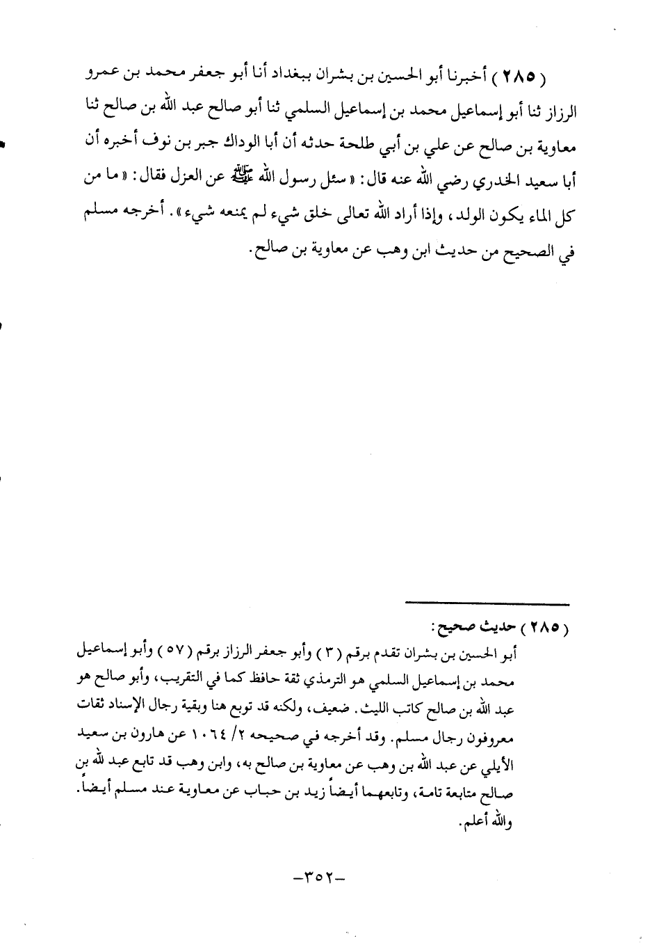 285 - أَخْبَرَنَا أَبُو الْحُسَيْنِ بْنُ بِشْرَانَ , بِبَغْدَادَ , أنا أَبُو جَعْفَرٍ , مُحَمَّدُ بْنِ عَمْرٍو الرَّزَّازُ ثنا أَبُو إِسْمَاعِيلَ , مُحَمَّدُ بْنُ إِسْمَاعِيلَ السُّلَمِيُّ , ثنا أَبُو صَالِحٍ عَبْدُ اللَّهِ بْنُ صَالِحٍ , ثنا مُعَاوِيَةُ بْنُ صَالِحٍ , عَنْ عَلِيِّ بْنِ أَبِي طَلْحَةَ , حَدَّثَهُ أَنَّ أَبَا الْوَدَّاكِ جَبْرَ بْنَ نَوْفٍ أَخْبَرَهُ أَنَّ أَبَا سَعِيدٍ الْخُدْرِيَّ رَضِيَ اللَّهُ عَنْهُ قَالَ: سُئِلَ رَسُولُ اللَّهِ صَلَّى اللهُ عَلَيْهِ وَسَلَّمَ عَنِ الْعَزْلِ فَقَالَ: §«مَا مِنْ كُلِّ الْمَاءِ يَكُونُ الْوَلَدُ , وَإِذَا أَرَادَ اللَّهُ تَعَالَى خَلْقَ شَيْءٍ لَمْ يَمْنَعْهُ شَيْءٌ» أَخْرَجَهُ مُسْلِمٌ فِي الصَّحِيحِ مِنْ حَدِيثِ ابْنِ وَهْبٍ عَنْ مُعَاوِيَةَ بْنِ صَالِحٍ
