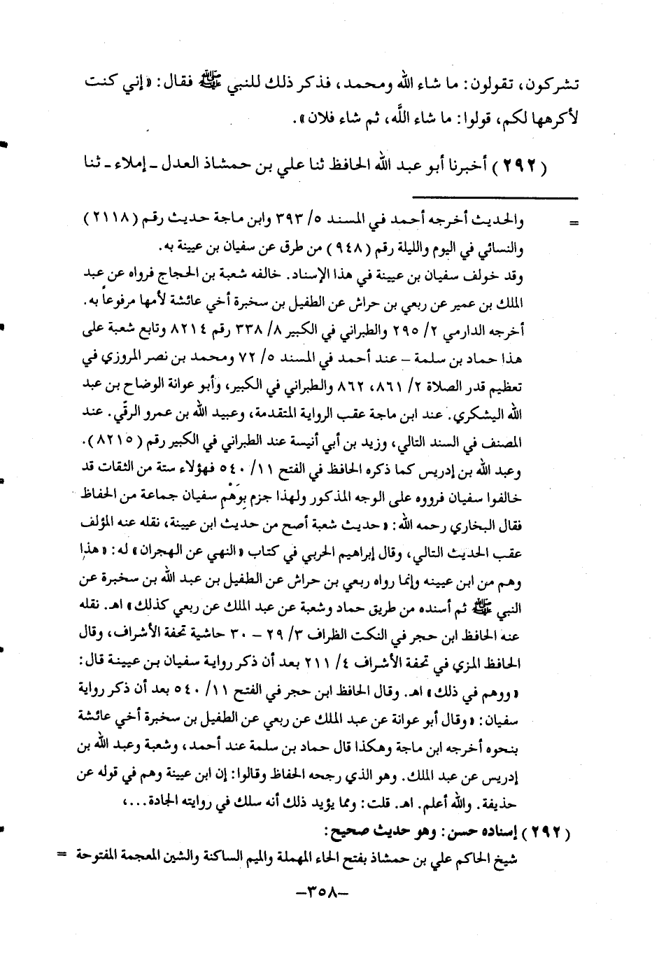 292 - أَخْبَرَنَا أَبُو عَبْدِ اللَّهِ الْحَافِظُ , ثنا عَلِيُّ بْنُ حَمْشَاذٍ الْعَدْلُ إِمْلَاءً ثنا -[359]- مُحَمَّدُ بْنُ عُثْمَانَ بْنِ أَبِي شَيْبَةَ , ثنا جَنْدَلُ بْنُ وَالِقٍ , ثنا عُبَيْدُ اللَّهِ بْنُ عَمْرٍو , عَنْ عَبْدِ الْمَلِكِ بْنِ عُمَيْرٍ , عَنْ رِبْعِيِّ بْنِ حِرَاشِ , عَنِ الطُّفَيْلِ بْنِ عَبْدِ اللَّهِ , وَكَانَ أَخَا عَائِشَةَ رَضِيَ اللَّهُ عَنْهَا لِأُمِّهَا أَنَّهُ رَأَى فِيمَا يَرَى النَّائِمُ أَنَّهُ لَقِيَ رَهْطًا مِنَ النَّصَارَى فَقَالَ: نِعْمَ الْقَوْمُ أَنْتُمْ لَوْلَا أَنَّكُمْ تَزْعُمُونَ أَنَّ الْمَسِيحَ ابْنُ اللَّهِ قَالَ: وَأَنْتُمُ الْقَوْمُ لَوْلَا أَنَّكُمْ تَقُولُونَ: مَا شَاءَ اللَّهُ وَشَاءَ مُحَمَّدٌ , ثُمَّ لَقِيَ رَهْطًا مِنَ الْيَهُودِ فَقَالَ: أَنْتُمُ الْقَوْمُ لَوْلَا أَنَّكُمْ تَزْعُمُونَ أَنَّ عُزَيْرًا ابْنُ اللَّهِ قَالَ: وَأَنْتُمْ قَوْمٌ تَقُولُونَ: مَا شَاءَ اللَّهُ وَشَاءَ مُحَمَّدٌ , قَالَ: فَأَتَى النَّبِيَّ صَلَّى اللهُ عَلَيْهِ وَسَلَّمَ فَقَصَّهَا عَلَيْهِ فَقَالَ صَلَّى اللهُ عَلَيْهِ وَسَلَّمَ: «حَدَّثْتَ بِهَا أَحَدًا بَعْدُ؟» فَقَالَ: نَعَمْ , فَحَمِدَ اللَّهَ تَعَالَى وَأَثْنَى عَلَيْهِ ثُمَّ قَالَ: " إِنَّ أَخَاكُمْ قَدْ رَأَى مَا بَلَغَكُمْ فَلَا تَقُولُوهَا , وَلَكِنْ §قُولُوا: مَا شَاءَ اللَّهُ وَحْدَهُ لَا -[364]- شَرِيكَ لَهُ «تَابَعَهُ شُعْبَةُ وَحَمَّادُ بْنُ سَلَمَةَ عَنْ عَبْدِ الْمَلِكِ بْنِ عُمَيْرٍ هَكَذَا وَفِي رِوَايَةِ شُعْبَةَ» وَلَكِنْ قُولُوا: مَا شَاءَ اللَّهُ ثُمَّ شَاءَ مُحَمَّدٌ " وَقِيلَ عَنْ عَبْدِ الْمَلِكِ عَنْ جَابِرِ بْنِ سَمُرَةَ قَالَ الْبُخَارِيُّ: حَدِيثُ شُعْبَةَ أَصَحُّ مِنْ حَدِيثِ ابْنِ عُيَيْنَةَ