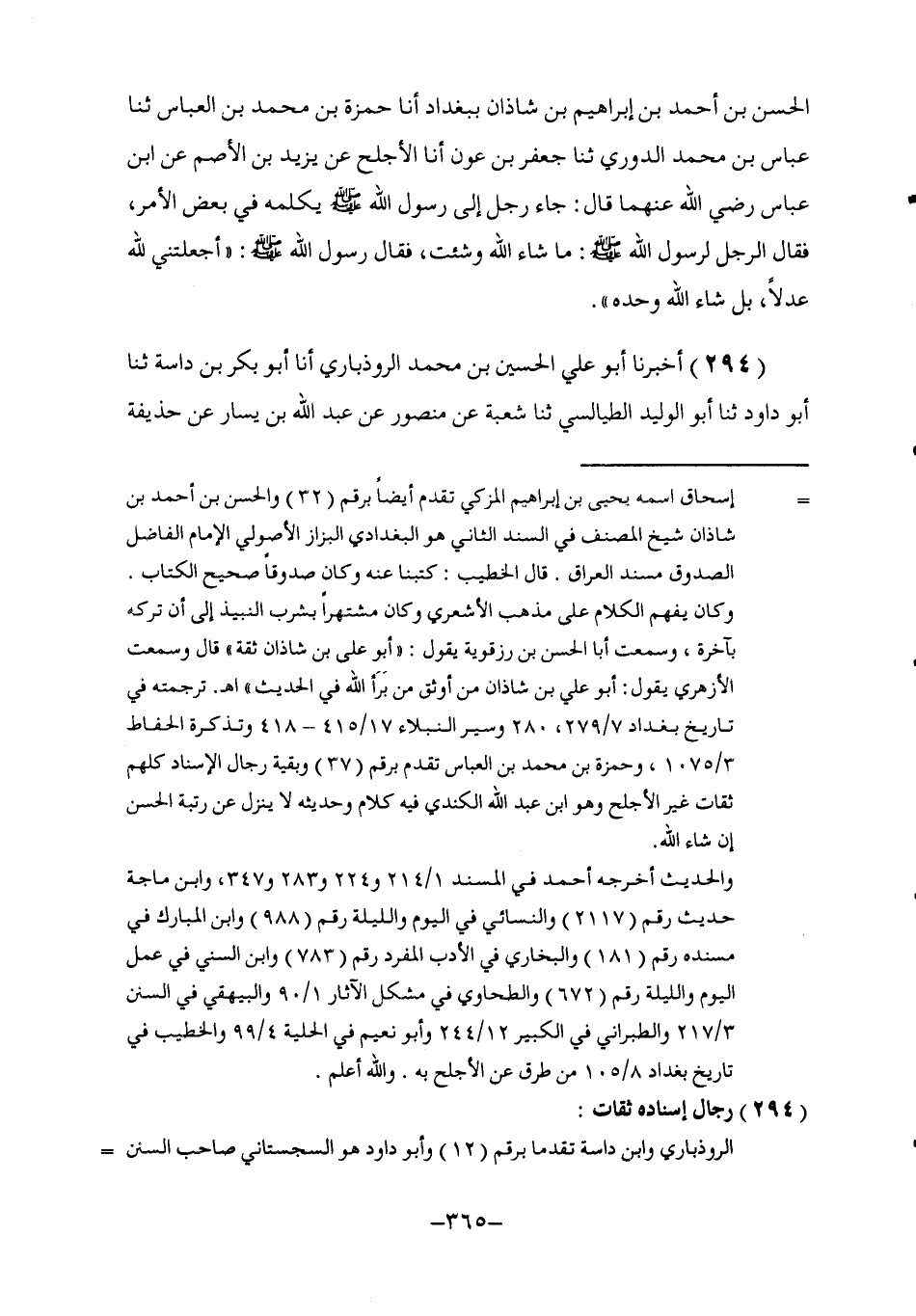 294 - أَخْبَرَنَا أَبُو عَلِيٍّ الْحُسَيْنُ بْنُ مُحَمَّدٍ الرُّوذْبَارِيُّ , أنا أَبُو بَكْرِ بْنُ دَاسَةَ , ثنا أَبُو دَاوُدَ , ثنا أَبُو الْوَلِيدِ الطَّيَالِسِيُّ , ثنا شُعْبَةُ , عَنْ مَنْصُورٍ , عَنْ عَبْدِ اللَّهِ بْنِ يَسَارٍ , عَنْ حُذَيْفَةَ، -[366]- رَضِيَ اللَّهُ عَنْهُ عَنِ النَّبِيِّ صَلَّى اللهُ عَلَيْهِ وَسَلَّمَ قَالَ: " §لَا تَقُولُوا مَا شَاءَ اللَّهُ وَشَاءَ فُلَانٌ وَلَكِنْ قُولُوا: مَا شَاءَ اللَّهُ ثُمَّ شَاءَ فُلَانٌ "