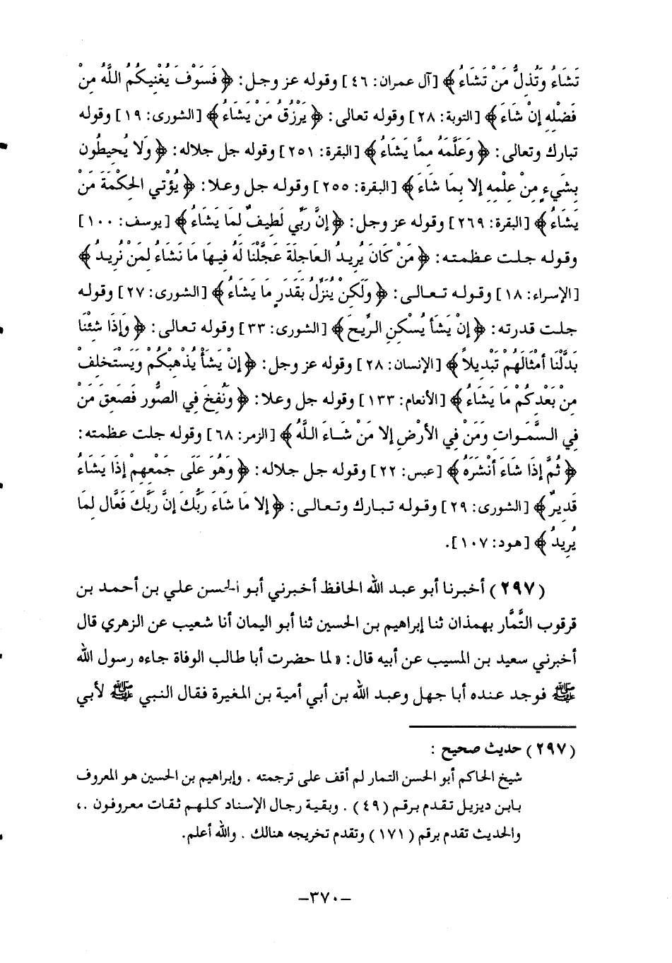 تَشَاءُ وَتُذِلُّ مَنْ تَشَاءُ} [آل عمران: 26] وَقَوْلِهِ عَزَّ وَجَلَّ: {فَسَوْفَ يُغْنِيكُمُ اللَّهُ مِنْ فَضْلِهِ إِنْ شَاءَ} [التوبة: 28] وَقَوْلِهِ تَعَالَى: {يَرْزُقُ مَنْ يَشَاءُ} [البقرة: 212] وَقَوْلِهِ تَبَارَكَ وَتَعَالَى: {وَعَلَّمَهُ مِمَّا يَشَاءُ} [البقرة: 251] وَقَوْلِهِ جَلَّ جَلَالُهُ: {وَلَا يُحِيطُونَ بِشَيْءٍ مِنْ عِلْمِهِ إِلَّا بِمَا شَاءَ} [البقرة: 255] وَقَوْلِهِ جَلَّ وَعَلَا: {يُؤْتِي الْحِكْمَةَ مَنْ يَشَاءُ} [البقرة: 269] وَقَوْلِهِ عَزَّ وَجَلَّ: {إِنَّ رَبِّي لَطِيفٌ لِمَا يَشَاءُ} [يوسف: 100] وَقَوْلِهِ جَلَّتْ عَظَمَتُهُ: {مَنْ كَانَ يُرِيدُ الْعَاجِلَةَ عَجَّلْنَا لَهُ فِيهَا مَا نَشَاءُ لِمَنْ نُرِيدُ} [الإسراء: 18] وَقَوْلِهِ تَعَالَى: {وَلَكِنْ يُنَزِّلُ بِقَدَرٍ مَا يَشَاءُ} [الشورى: 27] وَقَوْلِهِ جَلَّتْ قُدْرَتُهُ: {إِنْ يَشَأْ يُسْكِنِ الرِّيحَ} [الشورى: 33] وَقَوْلِهِ تَعَالَى: {وَإِذَا شِئْنَا بَدَّلْنَا أَمْثَالَهُمْ تَبْدِيلًا} [الإنسان: 28] وَقَوْلِهِ عَزَّ وَجَلَّ: {إِنْ يَشَأْ يُذْهِبْكُمْ وَيَسْتَخْلِفْ مِنْ بَعْدِكُمْ مَا يَشَاءُ} [الأنعام: 133] وَقَوْلِهِ جَلَّ وَعَلَا: {وَنُفِخَ فِي الصُّوَرِ فَصَعِقَ مَنْ فِي السَّمَاوَاتِ وَمَنْ فِي الْأَرْضِ إِلَّا مَنْ شَاءَ اللَّهُ} [الزمر: 68] وَقَوْلِهِ جَلَّتْ عَظَمَتُهُ: {ثُمَّ إِذَا شَاءَ أَنْشَرَهُ} [عبس: 22] وَقَوْلِهِ جَلَّ جَلَالُهُ {وَهُوَ عَلَى جَمْعِهِمْ إِذَا يَشَاءُ قَدِيرٌ} [الشورى: 29] وَقَوْلِهِ تَبَارَكَ وَتَعَالَى: {إِلَّا مَا شَاءَ رَبُّكَ إِنَّ رَبَّكَ فَعَّالٌ لِمَا يُرِيدُ} [هود: 107]