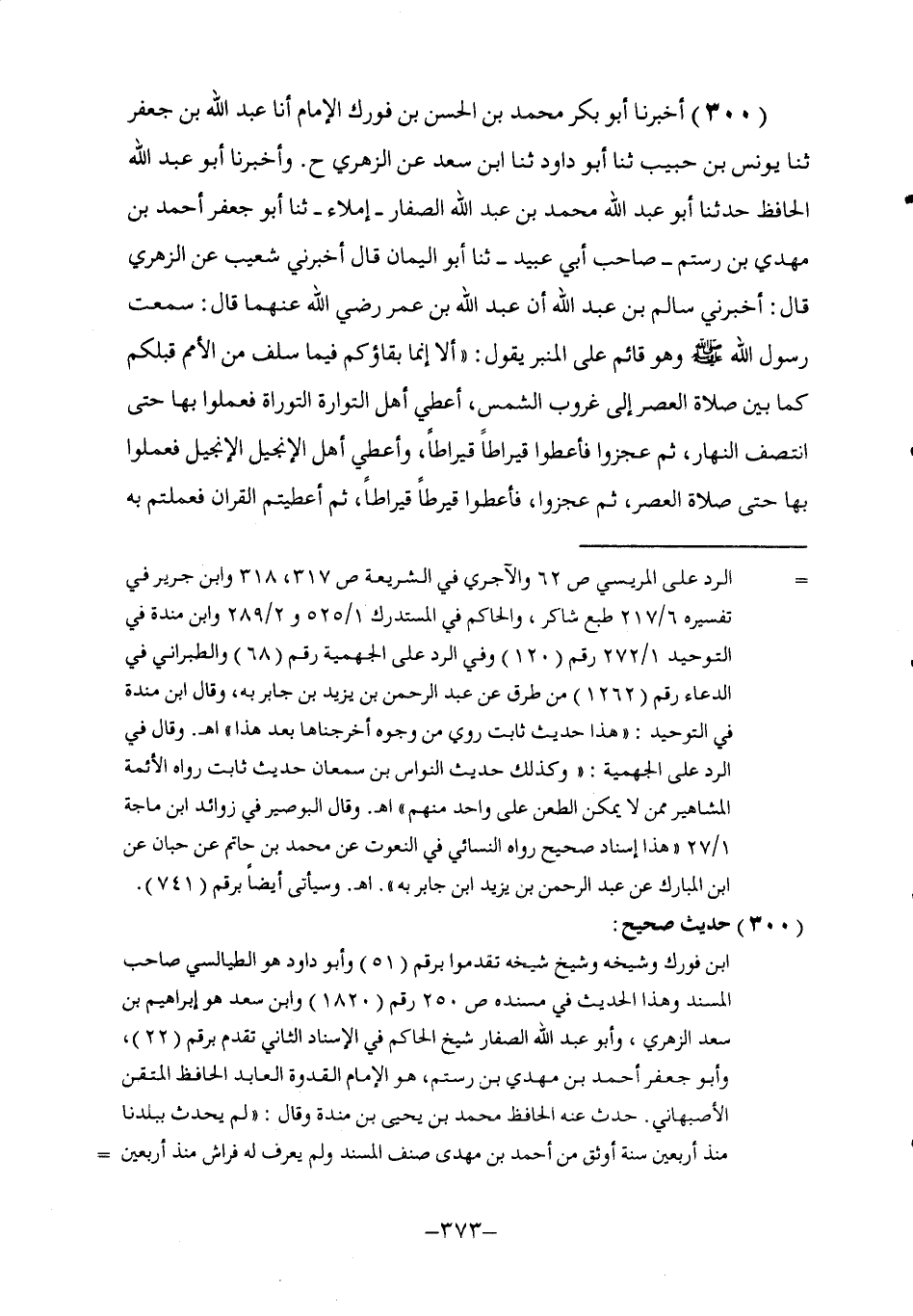 300 - أَخْبَرَنَا أَبُو بَكْرٍ مُحَمَّدُ بْنُ الْحَسَنِ بْنِ فُورَكٍ الْإِمَامُ , أنا عَبْدُ اللَّهِ بْنُ جَعْفَرٍ , ثنا يُونُسُ بْنُ حَبِيبٍ , ثنا أَبُو دَاوُدَ , ثنا ابْنُ سَعْدٍ , عَنِ الزُّهْرِيِّ ح , وَأَخْبَرَنَا أَبُو عَبْدِ اللَّهِ الْحَافِظُ , حَدَّثَنَا أَبُو عَبْدِ اللَّهِ مُحَمَّدُ بْنُ عَبْدِ اللَّهِ الصَّفَّارُ إِمْلَاءً ثنا أَبُو جَعْفَرٍ أَحْمَدُ بْنُ مَهْدِيِّ بْنِ رُسْتُمَ صَاحِبُ أَبِي عُبَيْدٍ ثنا أَبُو الْيَمَانِ قَالَ: أَخْبَرَنِي شُعَيْبٌ , عَنِ الزُّهْرِيِّ , قَالَ: أَخْبَرَنِي سَالِمُ بْنُ عَبْدِ اللَّهِ , أَنَّ عَبْدَ اللَّهِ بْنَ عُمَرَ , رَضِيَ اللَّهُ عَنْهُمَا قَالَ: سَمِعْتُ رَسُولَ اللَّهِ صَلَّى اللهُ عَلَيْهِ وَسَلَّمَ وَهُوَ قَائِمٌ عَلَى الْمِنْبَرِ يَقُولُ: " أَلَا إِنَّمَا بَقَاؤُكُمْ فِيمَا سَلَفَ مِنَ الْأُمَمِ قَبْلَكُمْ كَمَا بَيْنَ صَلَاةِ الْعَصْرِ إِلَى غُرُوبِ الشَّمْسِ أُعْطِيَ أَهْلَ التَّوْرَاةِ التَّوْرَاةَ فَعَمِلُوا بِهَا حَتَّى انْتَصَفَ النَّهَارُ , ثُمَّ عَجَزُوا فَأُعْطُوا قِيرَاطًا قِيرَاطًا , وَأُعْطِيَ أَهْلُ الْإِنْجِيلِ الْإِنْجِيلَ فَعَمِلُوا بِهَا حَتَّى صَلَاةِ الْعَصْرِ ثُمَّ عَجَزُوا فَأُعْطُوا قِيرَاطًا قِيرَاطًا، ثُمَّ أُعْطِيتُمُ الْقُرْآنَ فَعَمِلْتُمْ بِهِ -[374]- حَتَّى غُرُوبِ الشَّمْسِ فَأُعْطِيتم قِيرَاطَيْنِ قِيرَاطَيْنِ , فَقَالَ أَهْلُ التَّوْرَاةِ وَالْإِنْجِيلِ رَبَّنَا هَؤُلَاءِ أَقَلُّ عَمَلًا وَأَكْثَرُ أَجْرًا , فَقَالَ: هَلْ ظَلَمْتُكُمْ مِنْ أَجْرِكُمْ مِنْ شَيْءٍ؟ فَقَالُوا: لَا فَقَالَ: §فَضْلِي أُوتِيهِ مَنْ أَشَاءُ " لَفْظُ حَدِيثِ شُعَيْبٍ رَوَاهُ الْبُخَارِيُّ فِي الصَّحِيحِ عَنْ أَبِي الْيَمَانِ وَعَنْ عَبْدِ الْعَزِيزِ الْأَوْسِيِّ عَنْ إِبْرَاهِيمَ بْنِ سَعْدٍ