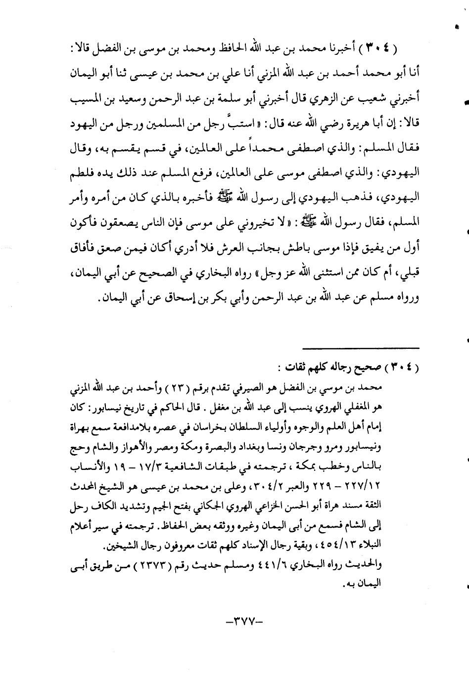 304 - أَخْبَرَنَا مُحَمَّدُ بْنُ عَبْدِ اللَّهِ الْحَافِظُ , وَمُحَمَّدُ بْنُ مُوسَى بْنِ الْفَضْلِ , قَالَا: أنا أَبُو مُحَمَّدٍ , أَحْمَدُ بْنُ عَبْدِ اللَّهِ الْمُزَنِيُّ , أنا عَلِيُّ بْنُ مُحَمَّدِ بْنِ عِيسَى , ثنا أَبُو الْيَمَانِ , أَخْبَرَنِي شُعَيْبٌ , عَنِ الزُّهْرِيِّ , قَالَ: أَخْبَرَنِي أَبُو سَلَمَةَ بْنُ عَبْدِ الرَّحْمَنِ , وَسَعِيدِ بْنِ الْمُسَيِّبِ , قَالَا: إِنَّ أَبَا هُرَيْرَةَ رَضِيَ اللَّهُ عَنْهُ قَالَ: اسْتَبَّ رَجُلٌ مِنَ الْمُسْلِمِينَ وَرَجُلٌ مِنَ الْيَهُودِ فَقَالَ الْمُسْلِمُ: وَالَّذِي اصْطَفَى مُحَمَّدًا عَلَى الْعَالَمِينَ , فِي قَسَمٍ يُقْسِمُ بِهِ , وَقَالَ الْيَهُودِيُّ: وَالَّذِي اصْطَفَى مُوسَى عَلَى الْعَالَمِينَ , فَرَفَعَ الْمُسْلِمُ عِنْدَ ذَلِكَ يَدَهُ فَلَطَمَ الْيَهُودِيَّ , فَذَهَبَ الْيَهُودِيُّ إِلَى رَسُولِ اللَّهِ صَلَّى اللهُ عَلَيْهِ وَسَلَّمَ فَأَخْبَرَهُ بِالَّذِي كَانَ مِنْ أَمْرِهِ وَأَمْرِ الْمُسْلِمِ , فَقَالَ رَسُولُ اللَّهِ صَلَّى اللهُ عَلَيْهِ وَسَلَّمَ: §«لَا تُخَيِّرُونِي عَلَى مُوسَى فَإِنَّ النَّاسَ يُصْعَقُونَ فَأَكُونُ أَوَّلَ مَنْ يُفِيقُ فَإِذَا مُوسَى بَاطِشٌ بِجَانِبِ الْعَرْشِ فَلَا أَدْرِي أَكَانَ فِيمَنْ صَعِقَ فَأَفَاقَ قَبْلِي أَمْ كَانَ مِمَّنِ اسْتَثْنَى اللَّهُ عَزَّ وَجَلَّ» رَوَاهُ الْبُخَارِيُّ فِي الصَّحِيحِ عَنْ أَبِي الْيَمَانِ , وَرَوَاهُ مُسْلِمٌ عَنْ عَبْدِ اللَّهِ بْنِ عَبْدِ الرَّحْمَنِ وَأَبِي بَكْرِ بْنِ إِسْحَاقَ عَنْ أَبِي الْيَمَانِ