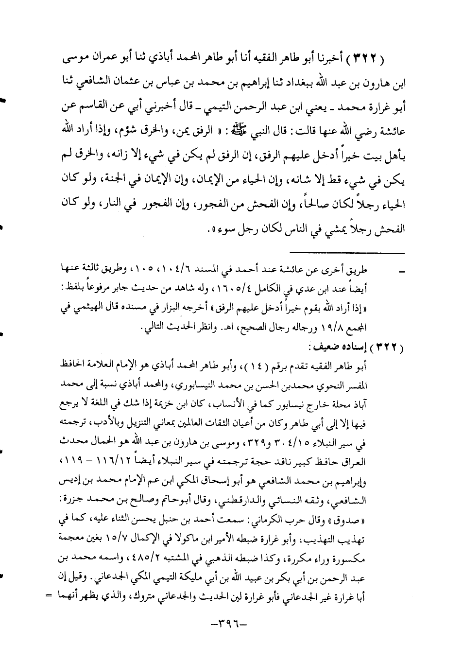 322 - أَخْبَرَنَا أَبُو طَاهِرٍ الْفَقِيهُ , أنا أَبُو طَاهِرٍ الْمُحَمَّدْ أَبَاذِيُّ , ثنا أَبُو عِمْرَانَ مُوسَى بْنُ هَارُونَ بْنِ عَبْدِ اللَّهِ بِبَغْدَادَ , ثنا إِبْرَاهِيمُ بْنُ مُحَمَّدِ بْنِ عَبَّاسِ بْنِ عُثْمَانَ الشَّافِعِيُّ , ثنا أَبُو غِرَارَةَ , مُحَمَّدٌ - يَعْنِي ابْنَ عَبْدِ الرَّحْمَنِ التَّيْمِيَّ - قَالَ: أَخْبَرَنِي أَبِي , عَنِ الْقَاسِمِ , عَنْ عَائِشَةَ , رَضِيَ اللَّهُ عَنْهَا قَالَتْ: قَالَ النَّبِيُّ صَلَّى اللهُ عَلَيْهِ وَسَلَّمَ: §«الرِّفْقُ يُمْنٌ , وَالْخَرْقُ شُؤْمٌ , وَإِذَا أَرَادَ اللَّهُ بِأَهْلِ بَيْتٍ خَيْرًا أَدْخَلَ عَلَيْهِمُ الرِّفْقَ إِنَّ الرِّفْقَ لَمْ يَكُنْ فِي شَيْءٍ إِلَّا زَانَهُ , وَالْخَرْقَ لَمْ يَكُنْ فِي شَيْءٍ قَطُّ إِلَّا شَانَهُ , وَإِنَّ الْحَيَاءَ مِنَ الْإِيمَانِ , وَإِنَّ الْإِيمَانَ فِي الْجَنَّةِ , وَلَوْ كَانَ الْحَيَاءُ رَجُلًا لَكَانَ صَالِحًا , وَإِنَّ الْفُحْشَ مِنَ الْفُجُورِ , وَإِنَّ الْفُجُورَ فِي النَّارِ , وَلَوْ كَانَ الْفُحْشُ رَجُلًا يَمْشِي فِي النَّاسِ لَكَانَ رَجُلَ سُوءٍ»