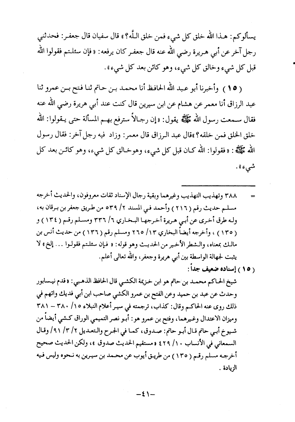 15 - وَأَخْبَرَنَا أَبُو عَبْدِ اللَّهِ الْحَافِظُ , أنا مُحَمَّدُ بْنُ حَاتِمٍ , ثَنَا فَتْحُ بْنُ عَمْرٍو , ثَنَا عَبْدُ الرَّزَّاقِ , أنا مَعْمَرٌ , عَنْ هِشَامٍ , عَنِ ابْنِ سِيرِينَ , قَالَ: كُنْتُ عِنْدَ أَبِي هُرَيْرَةَ رَضِيَ اللَّهُ عَنْهُ فَقَالَ: سَمِعْتُ رَسُولَ اللَّهِ صَلَّى اللهُ عَلَيْهِ وَسَلَّمَ يَقُولُ: " §إِنَّ رِجَالًا سَتَرْفَعُ بِهِمُ الْمَسْأَلَةُ حَتَّى يَقُولُوا: اللَّهُ خَلَقَ الْخَلْقَ فَمَنْ خَلْقَهُ؟ " قَالَ عَبْدُ الرَّزَّاقِ , قَالَ مَعْمَرٌ: وَزَادَ فِيهِ رَجُلٌ آخَرُ: فَقَالَ رَسُولُ اللَّهِ صَلَّى اللهُ عَلَيْهِ وَسَلَّمَ: " فَقُولُوا: اللَّهُ كَانَ قَبْلَ كُلِّ شَيْءٍ وَهُوَ خَالِقٌ كُلَّ شَيْءٍ وَهُوَ كَائِنٌ بَعْدَ كُلِّ شَيْءٍ "