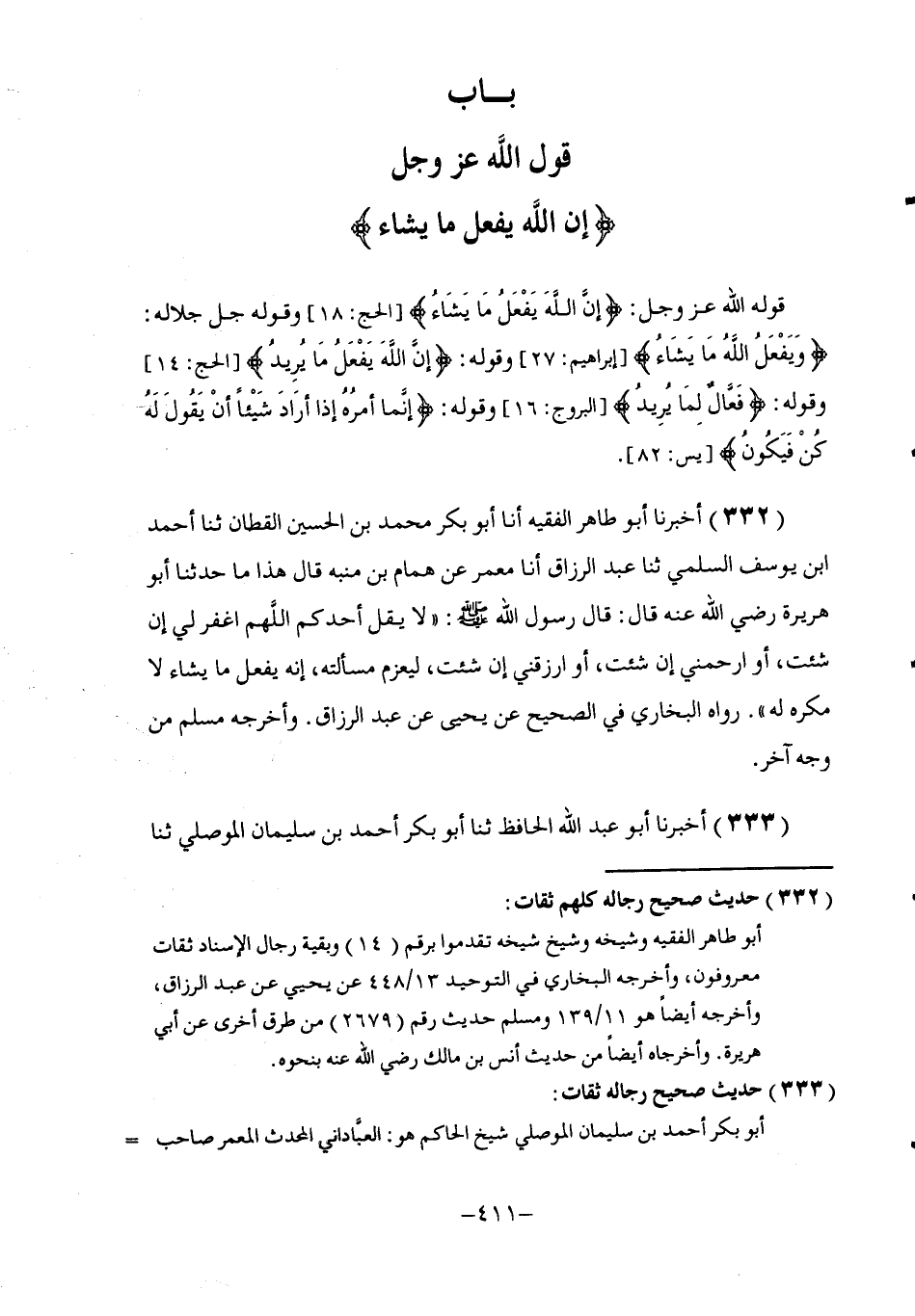 332 - أَخْبَرَنَا أَبُو طَاهِرٍ الْفَقِيهُ , أنا أَبُو بَكْرٍ مُحَمَّدُ بْنُ الْحُسَيْنِ الْقَطَّانُ , ثنا أَحْمَدُ بْنُ يُوسُفَ السُّلَمِيُّ , ثنا عَبْدُ الرَّزَّاقِ , أنا مَعْمَرٌ , عَنْ هَمَّامِ بْنِ مُنَبِّهٍ , قَالَ: هَذَا مَا حَدَّثَنَا أَبُو هُرَيْرَةَ , رَضِيَ اللَّهُ عَنْهُ قَالَ: قَالَ رَسُولُ اللَّهِ صَلَّى اللهُ عَلَيْهِ وَسَلَّمَ: §«لَا يَقُلْ أَحَدُكُمُ اللَّهُمَّ اغْفِرْ لِي إِنْ شِئْتَ أَوِ ارْحَمْنِي إِنْ شِئْتَ أَوِ ارْزُقْنِي إِنْ شِئْتَ لِيَعْزِمْ مَسْأَلَتَهُ , إِنَّهُ يَفْعَلُ مَا يَشَاءُ لَا مُكْرِهَ لَهُ» رَوَاهُ الْبُخَارِيُّ فِي الصَّحِيحِ عَنْ يَحْيَى عَنْ عَبْدِ الرَّزَّاقِ وَأَخْرَجَهُ مُسْلِمٌ مِنْ وَجْهٍ آخَرَ