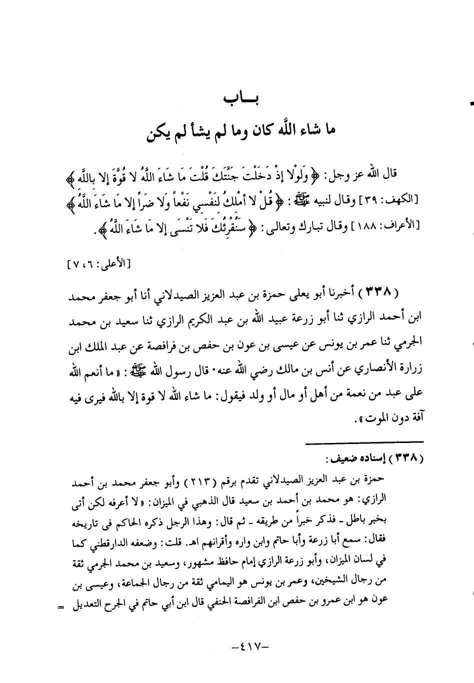 338 - أَخْبَرَنَا أَبُو يَعْلَى حَمْزَةُ بْنُ عَبْدِ الْعَزِيزِ الصَّيْدَلَانِيُّ , أَنَا أَبُو جَعْفَرٍ مُحَمَّدُ بْنُ أَحْمَدَ الرَّازِيُّ , ثنا أَبُو زُرْعَةَ عُبَيْدِ الْلَّهِ بْنُ عَبْدِ الْكَرِيمِ الرَّازِيُّ , ثنا سَعِيدُ بْنُ مُحَمَّدٍ الْجَرْمِيُّ , ثنا عُمَرُ بْنُ يُونُسَ , عَنْ عِيسَى بْنِ عَوْنِ بْنِ حَفْصِ بْنِ فُرَافِصَةَ , عَنْ عَبْدِ الْمَلِكِ بْنِ زُرَارَةَ الْأَنْصَارِيِّ , عَنْ أَنَسِ بْنِ مَالِكٍ , رَضِيَ اللَّهُ عَنْهُ: قَالَ رَسُولُ اللَّهِ صَلَّى اللهُ عَلَيْهِ وَسَلَّمَ: §" مَا أَنْعَمَ اللَّهُ عَلَى عَبْدٍ مِنِ نِعْمَةٍ مِنْ أَهْلٍ أَوْ مَالٍ أَوْ وَلَدٍ فَيَقُولُ: مَا شَاءَ اللَّهُ لَا قُوَّةُ إِلَّا بِاللَّهِ فَيَرَى فِيهِ آفَةً دُونَ الْمَوْتِ " -[418]-