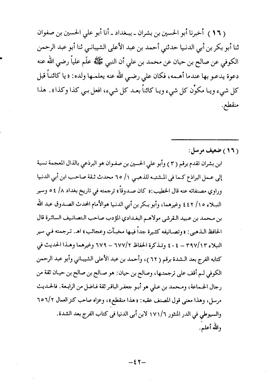 16 - أَخْبَرَنَا أَبُو الْحُسَيْنِ بْنُ بِشْرَانَ ـ بِبَغْدَادَ ـ أنا أَبُو عَلِيٍّ الْحُسَيْنُ بْنُ صَفْوَانَ , ثَنَا أَبُو بَكْرٍ بْنُ أَبِي الدُّنْيَا , حَدَّثَنِي أَحْمَدُ بْنُ عَبْدِ الْأَعْلَى الشَّيْبَانِيُّ , ثَنَا أَبُو عَبْدِ الرَّحْمَنِ الْكُوفِيُّ , عَنْ صَالِحِ بْنِ حَيَّانَ , عَنْ مُحَمَّدِ بْنِ عَلِيٍّ , أَنَّ النَّبِيَّ صَلَّى اللهُ عَلَيْهِ وَسَلَّمَ عَلَّمَ عَلِيًّا رَضِيَ اللَّهُ عَنْهُ دَعْوَةً يَدْعُو بِهَا عِنْدَمَا أَهَمَّهُ , فَكَانَ عَلِيٌّ رَضِيَ اللَّهُ عَنْهُ يُعَلِّمُهَا وَلَدَهُ: §«يَا كَائِنًا قَبْلَ كُلِّ شَيْءٍ وَيَا مُكَوِّنَ كُلِّ شَيْءٍ وَيَا كَائِنًا بَعْدَ كُلِّ شَيْءٍ , افْعَلْ بِي كَذَا وَكَذَا» هَذَا مُنْقَطِعٌ