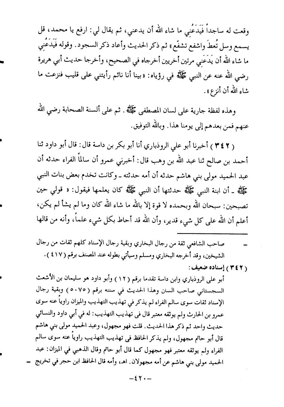 342 - أَخْبَرَنَا أَبُو عَلِيٍّ الرُّوذْبَارِيُّ , أنا أَبُو بَكْرِ بْنُ دَاسَةَ , قَالَ: قَالَ أَبُو دَاوُدَ , ثنا أَحْمَدُ بْنُ صَالِحٍ , ثنا عَبْدُ اللَّهِ بْنُ وَهْبٍ , قَالَ: أَخْبَرَنِي عَمْرٌو , أَنَّ سَالِمًا الْفَرَّاءَ , حَدَّثَهُ أَنَّ عَبْدَ الْحَمِيدِ مَوْلَى بَنِي هَاشِمٍ حَدَّثَهُ أَنَّ أُمَّهُ حَدَّثَتْهُ - وَكَانَتْ تَخْدُمُ بَعْضَ بَنَاتِ النَّبِيِّ صَلَّى اللهُ عَلَيْهِ وَسَلَّمَ - أَنَّ ابْنَةَ النَّبِيِّ , صَلَّى اللهُ عَلَيْهِ وَسَلَّمَ حَدَّثَتْهَا أَنَّ النَّبِيَّ صَلَّى اللهُ عَلَيْهِ وَسَلَّمَ كَانَ يُعَلِّمُهَا فَيَقُولُ: " §قُولِي حِينَ تُصْبِحِينَ: سُبْحَانَ اللَّهِ وَبِحَمْدِهِ لَا قُوَّةَ إِلَّا بِاللَّهِ مَا شَاءَ اللَّهُ كَانَ وَمَا لَمْ يَشَأْ لَمْ يَكُنْ أَعْلَمُ أَنَّ اللَّهَ عَلَى كُلِّ شَيْءٍ قَدِيرٌ , وَأَنَّ اللَّهَ قَدْ أَحَاطَ بِكُلِّ شَيْءٍ عِلْمًا , وَأَنَّهُ مَنْ قَالَهَا -[421]- حِينَ يُصْبِحُ حُفِظَ حَتَّى يُمْسِي وَمَنْ قَالَهَا حِينَ يُمْسِي حُفِظَ حَتَّى يُصْبِحَ "