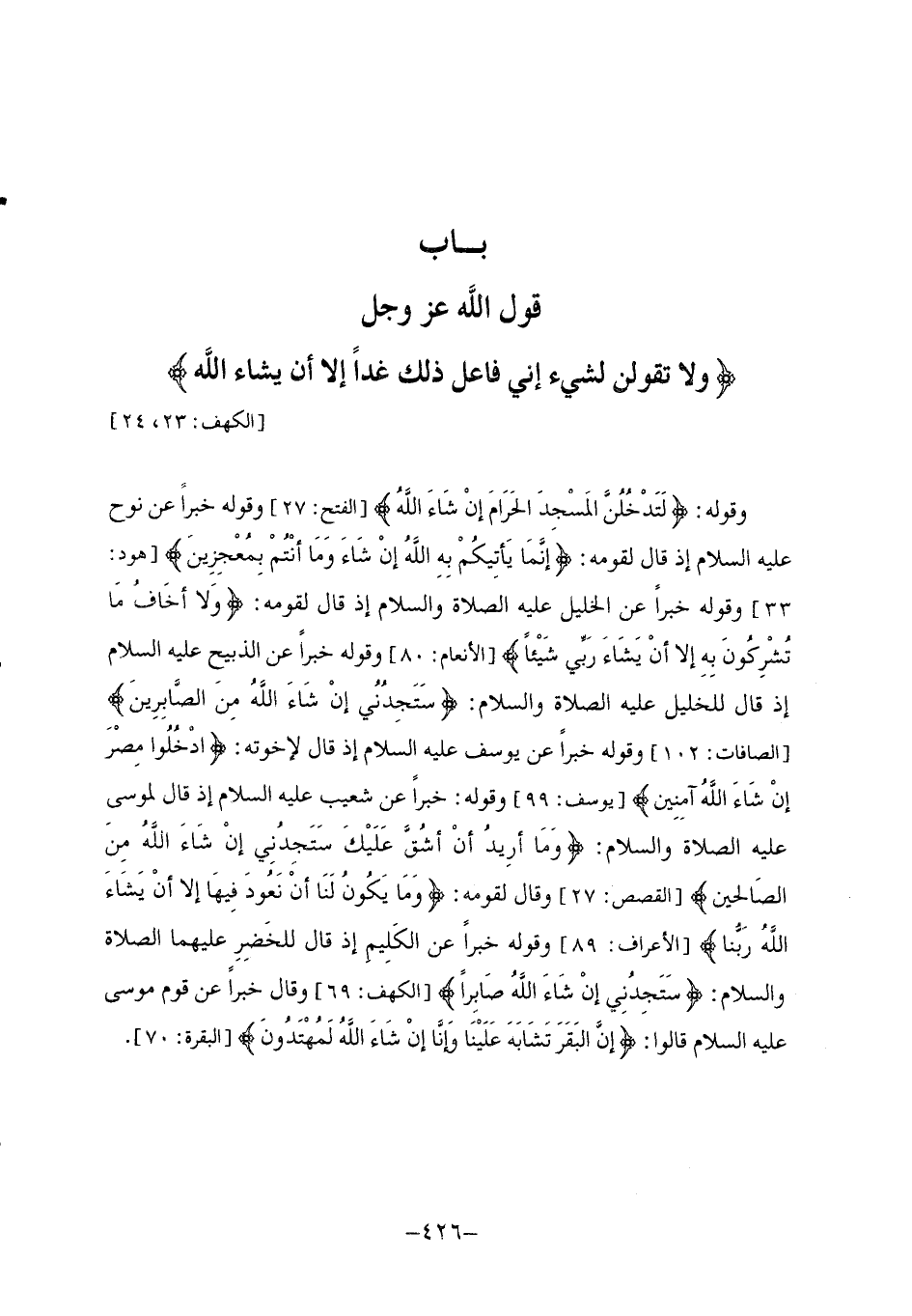 §بَابُ قَوْلِ اللَّهِ عَزَّ وَجَلَّ {وَلَا تَقُولَنَّ لِشَيْءٍ إِنِّي فَاعِلٌ ذَلِكَ غَدًا إِلَّا أَنْ يَشَاءَ اللَّهُ} [الكهف: 24] وَقَوْلِهِ: {لَتَدْخُلُنَّ الْمَسْجِدَ الْحَرَامَ إِنْ شَاءَ اللَّهُ} [الفتح: 27] , وَقَوْلِهِ خَبَرًا عَنْ نُوحٍ عَلَيْهِ السَّلَامُ إِذْ قَالَ لِقَوْمِهِ: {إِنَّمَا يَأْتِيكُمْ بِهِ اللَّهُ إِنْ شَاءَ وَمَا أَنْتُمْ بِمُعْجِزِينَ} [هود: 33] , وَقَوْلِهِ خَبَرًا عَنِ الْخَلِيلِ عَلَيْهِ الصَّلَاةُ وَالسَّلَامُ إِذْ قَالَ لِقَوْمِهِ: {وَلَا أَخَافُ مَا تُشْرِكُونَ بِهِ إِلَّا أَنْ يَشَاءَ رَبِّي شَيْئًا} [الأنعام: 80] , وَقَوْلِهِ خَبَرًا عَنِ الذَّبِيحِ عَلَيْهِ السَّلَامُ إِذْ قَالَ لِلْخَلِيلِ عَلَيْهِ الصَّلَاةُ وَالسَّلَامُ: {سَتَجِدُنِي إِنْ شَاءَ اللَّهُ مِنَ الصَّابِرِينَ} [الصافات: 102] , وَقَوْلِهِ خَبَرًا عَنْ يُوسُفَ عَلَيْهِ السَّلَامُ إِذْ قَالَ لِإِخْوَتِهِ: {ادْخُلُوا مِصْرَ إِنْ شَاءَ اللَّهُ آمِنِينَ} [يوسف: 99] , وَقَوْلِهِ خَبَرًا عَنْ شُعَيْبٍ عَلَيْهِ السَّلَامُ إِذْ قَالَ لِمُوسَى عَلَيْهِ الصَّلَاةُ وَالسَّلَامُ: {وَمَا أُرِيدُ أَنْ أَشُقَّ عَلَيْكَ سَتَجِدُنِي إِنْ شَاءَ اللَّهُ مِنَ الصَّالِحِينَ} [القصص: 27] , وَقَالَ لِقَوْمِهِ: {وَمَا يَكُونُ لَنَا أَنْ نَعُودَ فِيهَا إِلَّا أَنْ يَشَاءَ اللَّهُ رَبُّنَا} [الأعراف: 89] , وَقَوْلِهِ خَبَرًا عَنِ الْكَلِيمِ إِذْ قَالَ لِلْخَضِرِ عَلَيْهِمَا الصَّلَاةُ وَالسَّلَامُ: {سَتَجِدُنِي إِنْ شَاءَ اللَّهُ صَابِرًا} [الكهف: 69] , وَقَالَ خَبَرًا عَنْ قَوْمِ مُوسَى عَلَيْهِ السَّلَامُ قَالُوا: {إِنَّ الْبَقَرَ تَشَابَهَ عَلَيْنَا وَإِنَّا إِنْ شَاءَ اللَّهُ لَمُهْتَدُونَ} [البقرة: 70]