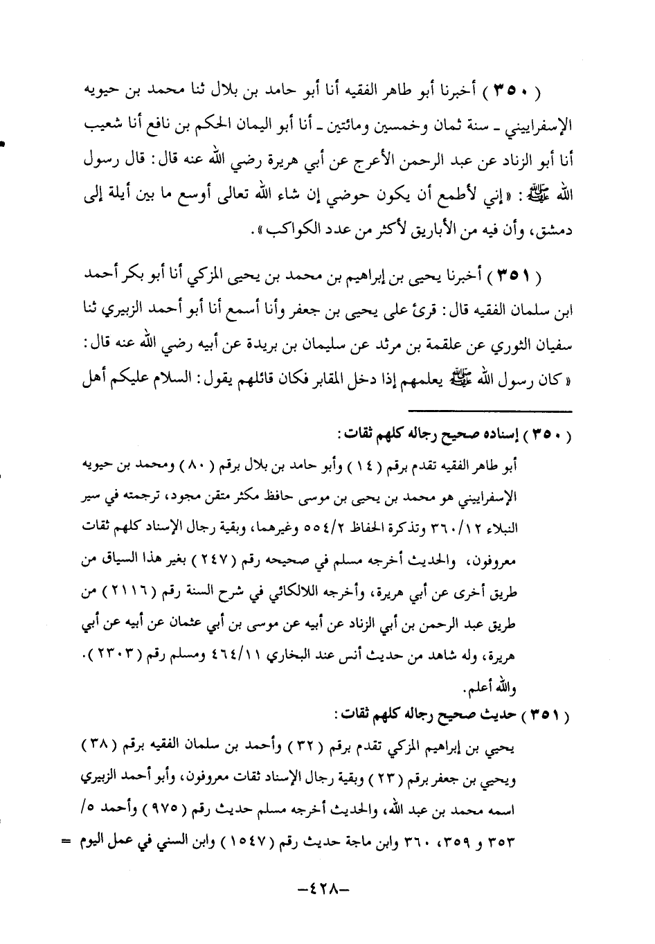 350 - أَخْبَرَنَا أَبُو طَاهِرٍ الْفَقِيهُ , أنا أَبُو حَامِدِ بْنُ بِلَالٍ , ثنا مُحَمَّدُ بْنُ حَيَّوَيْهِ الْإِسْفِرَايِينِيُّ , سَنَةَ ثَمَانٍ وَخَمْسِينَ وَمِائَتَيْنِ أنا أَبُو الْيَمَانِ الْحَكَمُ بْنُ نَافِعٍ , أنا شُعَيْبٌ , أنا أَبُو الزِّنَادِ , عَنْ عَبْدِ الرَّحْمَنِ الْأَعْرَجِ , عَنْ أَبِي هُرَيْرَةَ , رَضِيَ اللَّهُ عَنْهُ قَالَ: قَالَ رَسُولُ اللَّهِ صَلَّى اللهُ عَلَيْهِ وَسَلَّمَ: §«إِنِّي لَأَطْمَعُ أَنْ يَكُونَ حَوْضِي إِنْ شَاءَ اللَّهُ تَعَالَى أَوْسَعَ مَا بَيْنَ أَيْلَةَ إِلَى دِمَشْقٍ , وَإِنَّ فِيهِ مِنَ الْأَبَارِيقِ لَأَكْثَرُ مِنْ عَدَدِ الْكَوَاكِبِ»