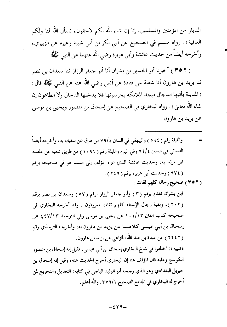 352 - أَخْبَرَنَا أَبُو الْحُسَيْنِ بْنُ بِشْرَانَ , أنا أَبُو جَعْفَرٍ الرَّزَّازُ , ثنا سَعْدَانُ بْنُ نَصْرٍ , ثنا يَزِيدُ بْنُ هَارُونَ , أَنَا شُعْبَةُ , عَنْ قَتَادَةَ , عَنْ أَنَسٍ , رَضِيَ اللَّهُ عَنْهُ عَنِ النَّبِيِّ صَلَّى اللهُ عَلَيْهِ وَسَلَّمَ قَالَ: §«الْمَدِينَةُ يَأْتِيهَا الدَّجَّالُ فَيَجِدُ الْمَلَائِكَةَ يَحْرُسُونَهَا فَلَا يَدْخُلُهَا الدَّجَّالُ وَلَا الطَّاعُونُ إِنْ شَاءَ اللَّهُ تَعَالَى» رَوَاهُ الْبُخَارِيُّ فِي الصَّحِيحِ عَنِ إِسْحَاقَ بْنِ مَنْصُورٍ وَيَحْيَى بْنِ مُوسَى عَنْ يَزِيدَ بْنِ هَارُونَ