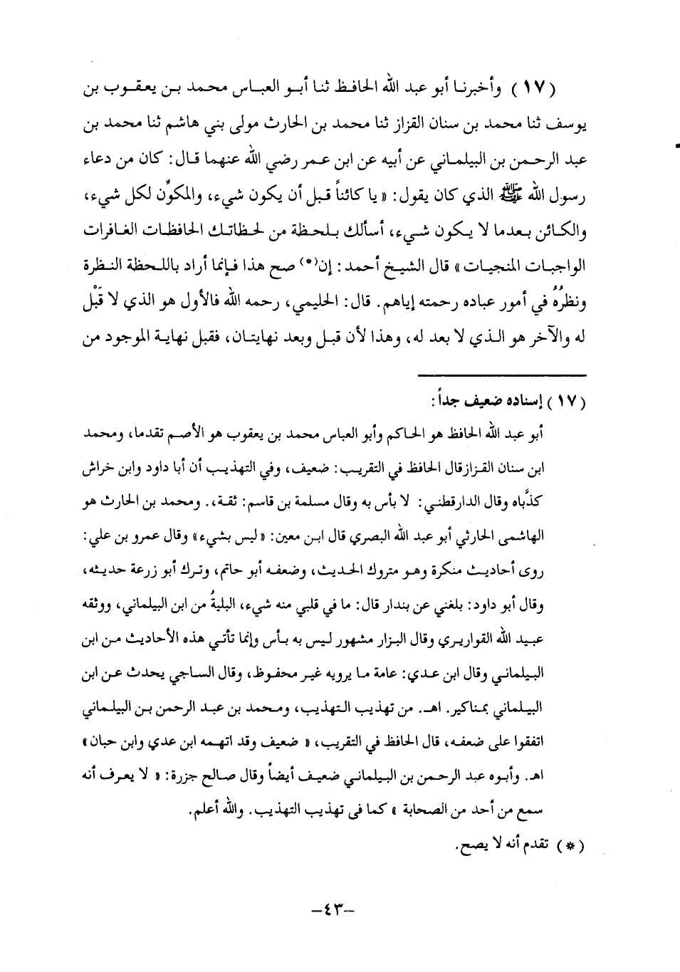 17 - وَأَخْبَرَنَا أَبُو عَبْدِ اللَّهِ الْحَافِظُ , ثَنَا أَبُو الْعَبَّاسِ مُحَمَّدُ بْنُ يَعْقُوبَ بْنِ يُوسُفَ , ثَنَا مُحَمَّدُ بْنُ سِنَانٍ الْقَزَّازُ , ثَنَا مُحَمَّدُ بْنُ الْحَارِثِ , مَوْلَى بَنِي هَاشِمٍ , ثَنَا مُحَمَّدُ بْنُ عَبْدِ الرَّحْمَنِ بْنِ الْبَيْلَمَانِيُّ , عَنْ أَبِيهِ , عَنِ ابْنِ عُمَرَ , رَضِيَ اللَّهُ عَنْهُمَا قَالَ: كَانَ §مِنْ دُعَاءِ رَسُولِ اللَّهِ صَلَّى اللهُ عَلَيْهِ وَسَلَّمَ الَّذِي كَانَ يَقُولُ: «يَا كَائِنًا قَبْلَ أَنْ يَكُونَ شَيْءٌ , وَالْمُكَوِّنُ لِكُلِّ شَيْءٍ , وَالْكَائِنُ بَعْدَمَا لَا يَكُونُ شَيْءٌ , أَسْأَلُكُ بِلَحْظَةٍ مِنْ لَحَظَاتِكَ الْحَافِظَاتِ الْغَافِرَاتِ الْوَاجِبَاتِ الْمُنْجِيَاتِ» قَالَ الشَّيْخُ أَحْمَدُ: إِنْ صَحَّ هَذَا فَإِنَّمَا أَرَادَ بِاللَّحْظَةِ النَّظْرَةَ وَنَظَرُهُ فِي أُمُورِ عِبَادِهِ رَحْمَتُهُ إِيَّاهُمْ , قَالَ الْحَلِيمِيُّ رَحِمَهُ اللَّهُ: فَالْأَوَّلُ هُوَ الَّذِي لَا قَبْلَ لَهُ وَالْآخِرُ هُوَ الَّذِي لَا بَعْدَ لَهُ , وَهَذَا لِأَنَّ قَبْلَ وَبَعْدَ نِهَايَتَانِ , فَقَبْلُ نِهَايَةُ الْمَوْجُودِ مِنْ -[44]- قَبْلِ ابْتِدَائِهِ , وَبَعْدُ غَايَتُهُ مِنْ قَبْلِ انْتِهَائِهِ فَإِذَا لَمْ يَكُنْ لَهُ ابْتِدَاءٌ وَلَا انْتِهَاءٌ لَمْ يَكُنْ لِلْمَوْجُودِ قَبْلُ وَلَا بَعْدُ , فَكَانَ هُوَ الْأَوَّلُ وَالْآخِرُ، وَمِنْهَا الْبَاقِي , قَالَ اللَّهُ عَزَّ وَجَلَّ: {وَيَبْقَى وَجْهُ رَبِّكَ ذُو الْجَلَالِ وَالْإِكْرَامِ} [الرحمن: 27] وَقَدْ رُوِّينَاهُ فِي حَدِيثِ الْوَلِيدِ بْنِ مُسْلِمٍ قَالَ الْحَلِيمِيُّ - رَحِمَهُ اللَّهُ -: وَهَذَا أَيْضًا مِنْ لوازمِ قَوْلِهِ: قَدِيمٌ , لِأَنَّهُ إِذَا كَانَ مَوْجُودًا لَا عَنْ أَوَّلٍ وَلَا بِسَبَبٍ لَمْ يَجُزْ عَلَيْهِ الِانْقِضَاءُ وَالْعَدَمُ , فَإِنَّ كُلَّ مُنْقَضٍ بَعْدَ وُجُودِهِ فَإِنَّمَا يَكُونُ انْقِضَاؤُهُ لِانْقِطَاعِ سَبَبِ وُجُودِهِ , فَلَمَّا لَمْ يَكُنْ لوُجُودِ الْقَدِيمِ سَبَبٌ فَيُتَوَهَّمُ أَنَّ ذَلِكَ السَّبَبَ إِنِ ارْتَفَعَ عُدِمَ عَلِمْنَا أَنَّهُ لَا انْقِضَاءَ لَهُ قَالَ الشَّيْخُ أَحْمَدُ: وَفِي مَعْنَى الْبَاقِي: الدَّائِمُ وَهُوَ فِي رِوَايَةِ عَبْدِ الْعَزِيزِ بْنِ الْحُصَيْنِ , قَالَ أَبُو سُلَيْمَانَ الْخَطَّابِيُّ فِيمَا أُخْبِرْتُ عَنْهُ: الدَّائِمُ الْمَوْجُودُ لَمْ يَزَلْ , الْمَوْصُوفُ بِالْبَقَاءِ , الَّذِي لَا يَسْتَوْلِي عَلَيْهِ الْفَنَاءُ , قَالَ: وَلَيْسَتْ صِفَةُ بَقَائِهِ وَدَوَامِهِ كَبَقَاءِ الْجَنَّةِ وَالنَّارِ وَدَوَامِهِمَا وَذَلِكَ أَنَّ بَقَاءَهُ أَبْدِيٌّ أَزَلِيٌّ , وَبَقَاءُ الْجَنَّةِ وَالنَّارِ أَبْدِيُّ غَيْرُ أَزَلِيٍّ , وَصِفَةُ الْأَزَلِ مَا لَمْ يَزَلْ , وَصِفَةُ الْأَبَدِ مَا لَا يَزَالُ , وَالْجَنَّةُ وَالنَّارُ مَخْلُوقَتَانِ كَائِنَتَانِ بَعْدَ أَنْ لَمْ تَكُونَا , فَهَذَا فَرْقُ مَا بَيْنَ الْأَمْرَيْنِ وَاللَّهُ أَعْلَمُ وَمِنْهَا الْحَقُّ الْمُبِينُ , قَالَ اللَّهُ جَلَّ ثَنَاؤُهُ: {وَيَعْلَمُونَ أَنَّ اللَّهَ هُوَ الْحَقُّ الْمُبِينُ} [النور: 25]