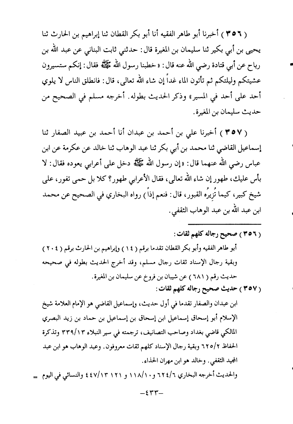 356 - أَخْبَرَنَا أَبُو طَاهِرٍ الْفَقِيهُ , أنا أَبُو بَكْرٍ الْقَطَّانُ , ثنا إِبْرَاهِيمُ بْنُ الْحَارِثِ , ثنا يَحْيَى بْنُ أَبِي بُكَيْرٍ , ثنا سُلَيْمَانُ بْنُ الْمُغِيرَةِ , قَالَ: حَدَّثَنِي ثَابِتٌ الْبُنَانِيُّ , عَنْ عَبْدِ اللَّهِ بْنِ رَبَاحٍ , عَنْ أَبِي قَتَادَةَ , رَضِيَ اللَّهُ عَنْهُ قَالَ: خَطَبَنَا رَسُولُ اللَّهِ صَلَّى اللهُ عَلَيْهِ وَسَلَّمَ فَقَالَ: §«إِنَّكُمْ سَتَسِيرُونَ عَشِيَّتَكُمْ وَلَيْلَتَكُمْ ثُمَّ تَأْتُونَ الْمَاءَ غَدًا إِنْ شَاءَ اللَّهُ تَعَالَى» , قَالَ: فَانْطَلَقَ النَّاسُ لَا يَلْوِي أَحَدٌ عَلَى أَحَدٍ فِي الْمَسِيرِ " وَذَكَرَ الْحَدِيثَ بِطُولِهِ أَخْرَجَهُ مُسْلِمٌ فِي الصَّحِيحِ مِنْ حَدِيثِ سُلَيْمَانَ بْنِ الْمُغِيرَةِ