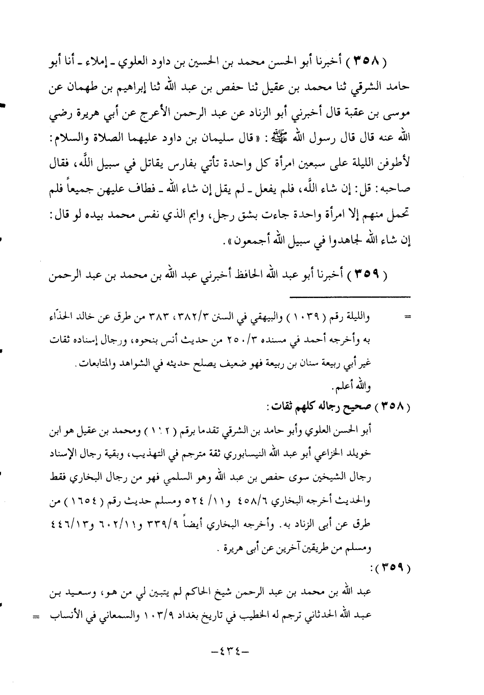 358 - أَخْبَرَنَا أَبُو الْحَسَنِ مُحَمَّدُ بْنُ الْحُسَيْنِ بْنِ دَاوُدَ الْعَلَوِيُّ إِمْلَاءً أنا أَبُو حَامِدٍ الشَّرْقِيُّ , ثنا مُحَمَّدُ بْنُ عَقِيلٍ , ثنا حَفْصُ بْنُ عَبْدِ اللَّهِ , ثنا إِبْرَاهِيمُ بْنُ طَهْمَانَ , عَنْ مُوسَى بْنِ عُقْبَةَ , قَالَ: أَخْبَرَنِي أَبُو الزِّنَادِ , عَنْ عَبْدِ الرَّحْمَنِ الْأَعْرَجِ , عَنْ أَبِي هُرَيْرَةَ , رَضِيَ اللَّهُ عَنْهُ قَالَ: قَالَ رَسُولُ اللَّهِ صَلَّى اللهُ عَلَيْهِ وَسَلَّمَ: " §قَالَ سُلَيْمَانُ بْنُ دَاوُدَ عَلَيْهِمَا الصَّلَاةُ وَالسَّلَامُ: لَأَطُوفَنَّ اللَّيْلَةَ عَلَى سَبْعِينَ امْرَأَةً كُلُّ وَاحِدَةٍ تَأْتِي بِفَارِسٍ يُقَاتِلُ فِي سَبِيلِ اللَّهِ , فَقَالَ صَاحِبُهُ: قُلْ إِنْ شَاءَ اللَّهُ , فَلَمْ يَفْعَلْ لَمْ يَقُلْ إِنْ شَاءَ اللَّهُ فَطَافَ عَلَيْهِنَّ جَمِيعًا فَلَمْ تَحْمِلِ مِنْهُمْ إِلَّا امْرَأَةٌ وَاحِدَةٌ جَاءَتْ بِشِقِّ رَجُلٍ , وَايْمُ الَّذِي نَفْسُ مُحَمَّدٍ بِيَدِهِ لَوْ قَالَ: إِنْ شَاءَ اللَّهُ لَجَاهَدُوا فِي سَبِيلِ اللَّهِ أَجْمَعُونَ "