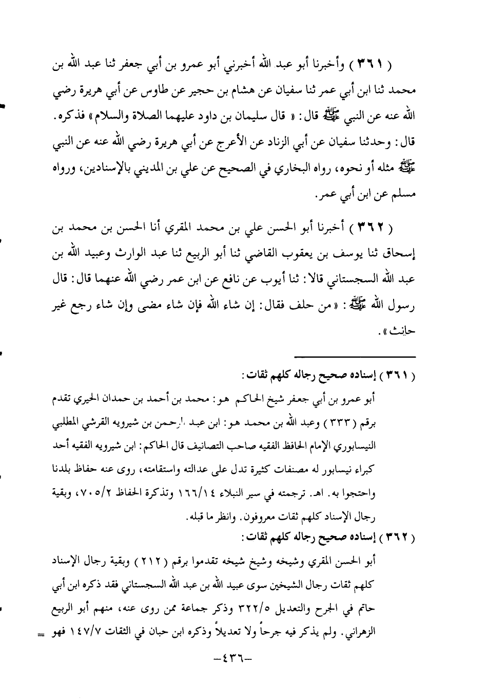 362 - أَخْبَرَنَا أَبُو الْحَسَنِ عَلِيُّ بْنُ مُحَمَّدٍ الْمُقْرِئُ , أنا الْحَسَنُ بْنُ مُحَمَّدِ بْنِ إِسْحَاقَ , ثنا يُوسُفُ بْنُ يَعْقُوبَ الْقَاضِي , ثنا أَبُو الرَّبِيعِ , ثنا عَبْدُ الْوَارِثِ , وَعُبَيْدُ اللَّهِ بْنُ عَبْدِ اللَّهِ السِّجِسْتَانِيُّ , قَالَا: ثنا أَيُّوبُ , عَنْ نَافِعٍ , عَنِ ابْنِ عُمَرَ , رَضِيَ اللَّهُ عَنْهُمَا قَالَ: قَالَ رَسُولُ اللَّهِ صَلَّى اللهُ عَلَيْهِ وَسَلَّمَ: §«مَنْ حَلَفَ فَقَالَ إِنْ شَاءَ اللَّهُ فَإِنْ شَاءَ مَضَى وَإِنْ شَاءَ رَجَعَ غَيْرَ حَانِثٍ»