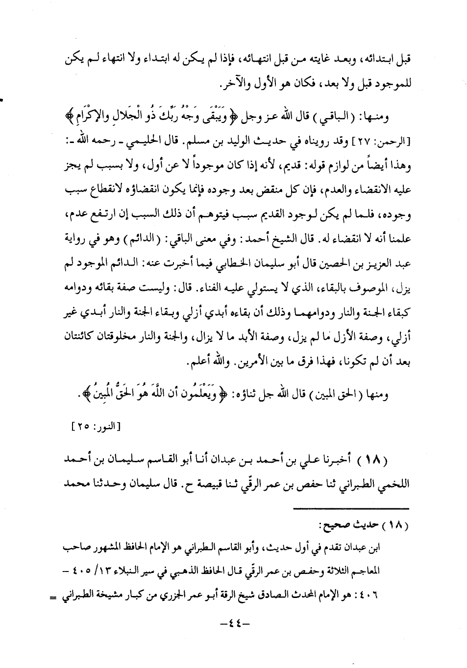 18 - أَخْبَرَنَا عَلِيُّ بْنُ أَحْمَدَ بْنِ عَبْدَانَ , أنا أَبُو الْقَاسِمِ سُلَيْمَانُ بْنُ أَحْمَدَ اللَّخْمِيُّ الطَّبَرَانِيُّ , ثَنَا حَفْصُ بْنُ عُمَرَ الرَّقِّيُّ , ثَنَا قَبِيصَةُ , ح قَالَ سُلَيْمَانُ: وَحَدَّثَنَا مُحَمَّدُ -[45]- بْنُ الْحَسَنِ بْنِ كَيْسَانَ , ثَنَا أَبُو حُذَيْفَةَ , ثَنَا سُفْيَانُ , عَنِ ابْنِ جُرَيْجٍ , عَنْ سُلَيْمَانَ الْأَحْوَلِ , عَنْ طَاوُسٍ , عَنِ ابْنِ عَبَّاسٍ , رَضِيَ اللَّهُ عَنْهُ قَالَ: كَانَ النَّبِيُّ صَلَّى اللهُ عَلَيْهِ وَسَلَّمَ §إِذَا تَهَجَّدَ مِنَ اللَّيْلِ يَدْعُو: «اللَّهُمَّ لَكَ الْحَمْدُ أَنْتَ رَبُّ السَّمَاوَاتِ وَالْأَرْضِ وَمَا فِيهِنَّ وَلَكَ الْحَمْدُ أَنْتَ نُورُ السَّمَاوَاتِ وَالْأَرْضِ وَمَا فِيهِنَّ وَلَكَ الْحَمْدُ , أَنْتَ قَيِّمُ السَّمَاوَاتِ وَالْأَرْضِ وَمَنْ فِيهِنَّ أَنْتَ الْحَقُّ , وَقَوْلُكَ حَقُّ , وَوَعْدُكَ حَقُّ , وَلِقَاؤُكَ حَقُّ , وَالْجَنَّةُ حَقٌّ , وَالنَّارُ حَقٌّ وَالسَّاعَةُ حَقٌّ , اللَّهُمَّ لَكَ أَسْلَمْتُ وَبِكَ آمَنْتُ وَعَلَيْكَ تَوَكَّلْتُ وَإِلَيْكَ أَنَبْتُ وَبِكَ خَاصَمْتُ وَإِلَيْكَ حَاكَمْتُ فَاغْفِرْ لِي مَا قَدَّمْتُ وَمَا أَخَّرْتُ وَمَا أَسْرَرْتُ وَمَا أَعْلَنْتُ أَنْتَ إِلَهِيَ لَا إِلَهَ إِلَّا أَنْتَ» رَوَاهُ الْبُخَارِيُّ فِي الصَّحِيحِ عَنْ قَبِيصَةَ , وَهُمَا مَذْكُورَانِ فِي خَبَرِ الْأَسَامِي: أَحَدُهُمَا فِي رِوَايَةِ الْوَلِيدِ بْنِ مُسْلِمٍ وَالْآخَرُ فِي رِوَايَةِ عَبْدِ الْعَزِيزِ قَالَ الْحَلِيمِيُّ رَحِمَهُ اللَّهُ: الْحَقُّ مَا لَا يَسَعُ إِنْكَارُهُ وَيَلْزَمُ إِثْبَاتُهُ وَالِاعْتِرَافَ بِهِ , وَوُجُودُ الْبَارِي عَزَّ ذِكْرُهُ أَوْلَى مَا يَجِبُ الِاعْتِرَافُ بِهِ يَعْنِي عِنْدَ وُرُودِ أَمْرِهِ بِالِاعْتِرَافِ بِهِ وَلَا يَسَعُ جُحُودُهُ إِذْ لَا مُثْبَتَ يُتَظَاهَرُ عَلَيْهِ مِنَ الدَّلَائِلِ الْبَيِّنَةِ الْبَاهِرَةِ مَا تَظَاهَرَتْ -[46]- عَلَى وُجُودِ الْبَارِي جَلَّ ثَنَاؤُهُ وَقَالَ: وَالْمُبِينُ هُوَ الَّذِي لَا يَخْفَى وَلَا يَنْكَتِمْ , وَالْبَارِي جَلَّ ثَنَاؤُهُ لَيْسَ بِخَافٍ وَلَا مُنْكَتِمٍ لِأَنَّ لَهُ مِنَ الْأَفْعَالِ الدَّالَّةِ عَلَيْهِ مَا يَسْتَحِيلُ مَعَهَا أَنْ يَخْفَى فَلَا يُوقَفُ عَلَيْهِ وَلَا يُدْرَى وَمِنْهَا الظَّاهِرُ قَالَ اللَّهُ جَلَّ ثَنَاؤُهُ: {هُوَ الْأَوَّلُ وَالْآخِرُ وَالظَّاهِرُ وَالْبَاطِنُ} [الحديد: 3] وَهُوَ فِي خَبَرِ الْأَسَامِي وَغَيْرِهِ